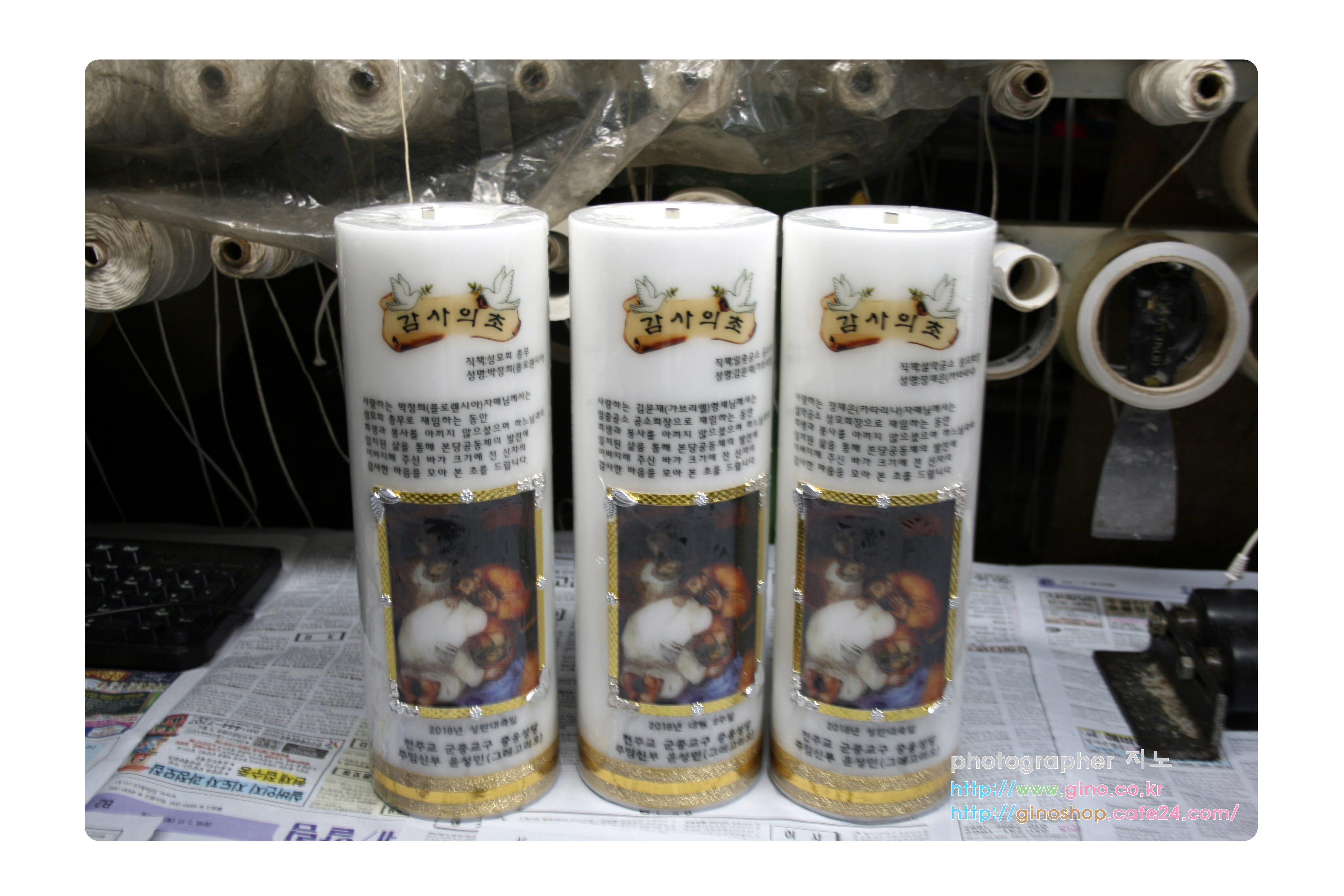 군종교구 충용성당 에서 그동안 수고하시는 분들의 이름과 감사의 내용을 담아 주문 제작을 하신 감사의초 캔들입니다.