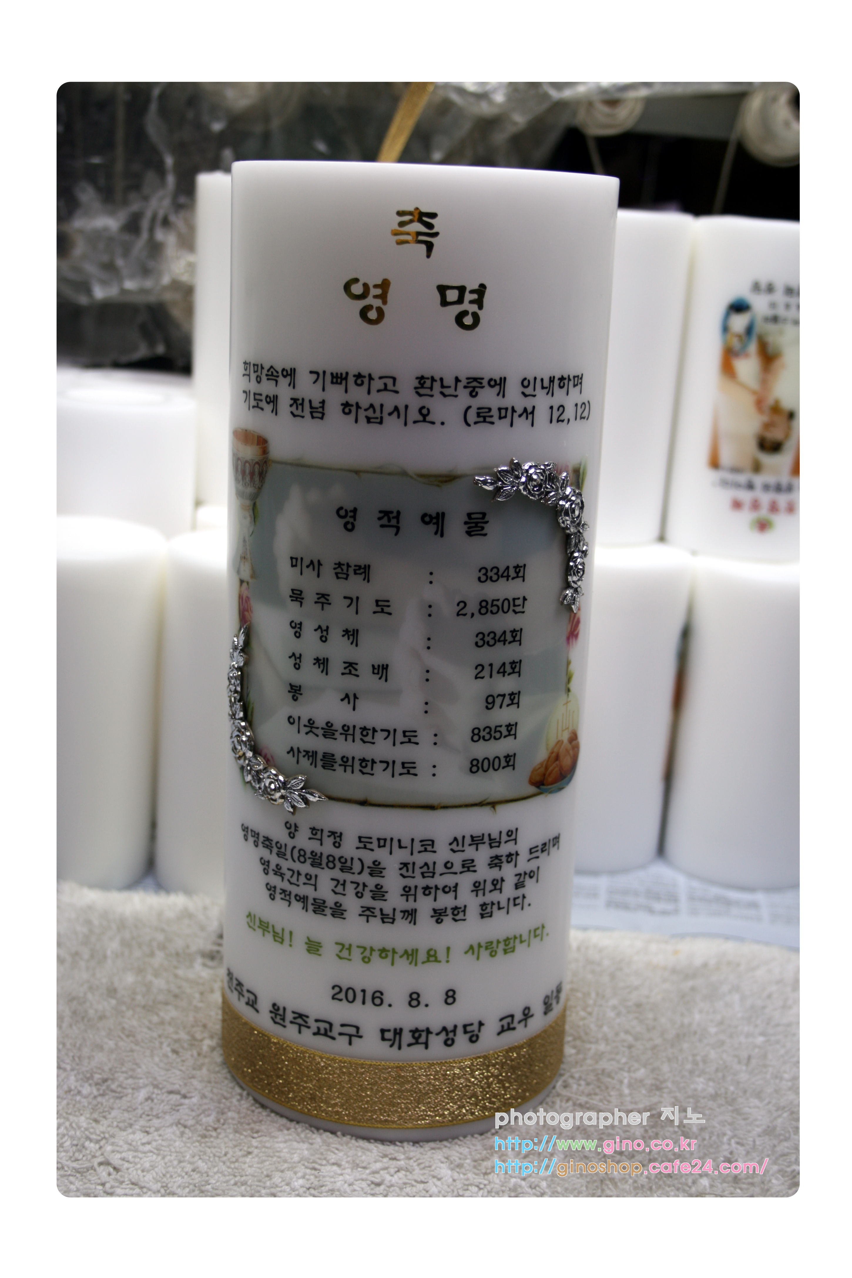 원주교구 대화성당에서 양희정(도미니코)신부님 영명축일 맞이하여 정성스런 영적예물을 담아 주문 제작을 하신 캔들 입니다.