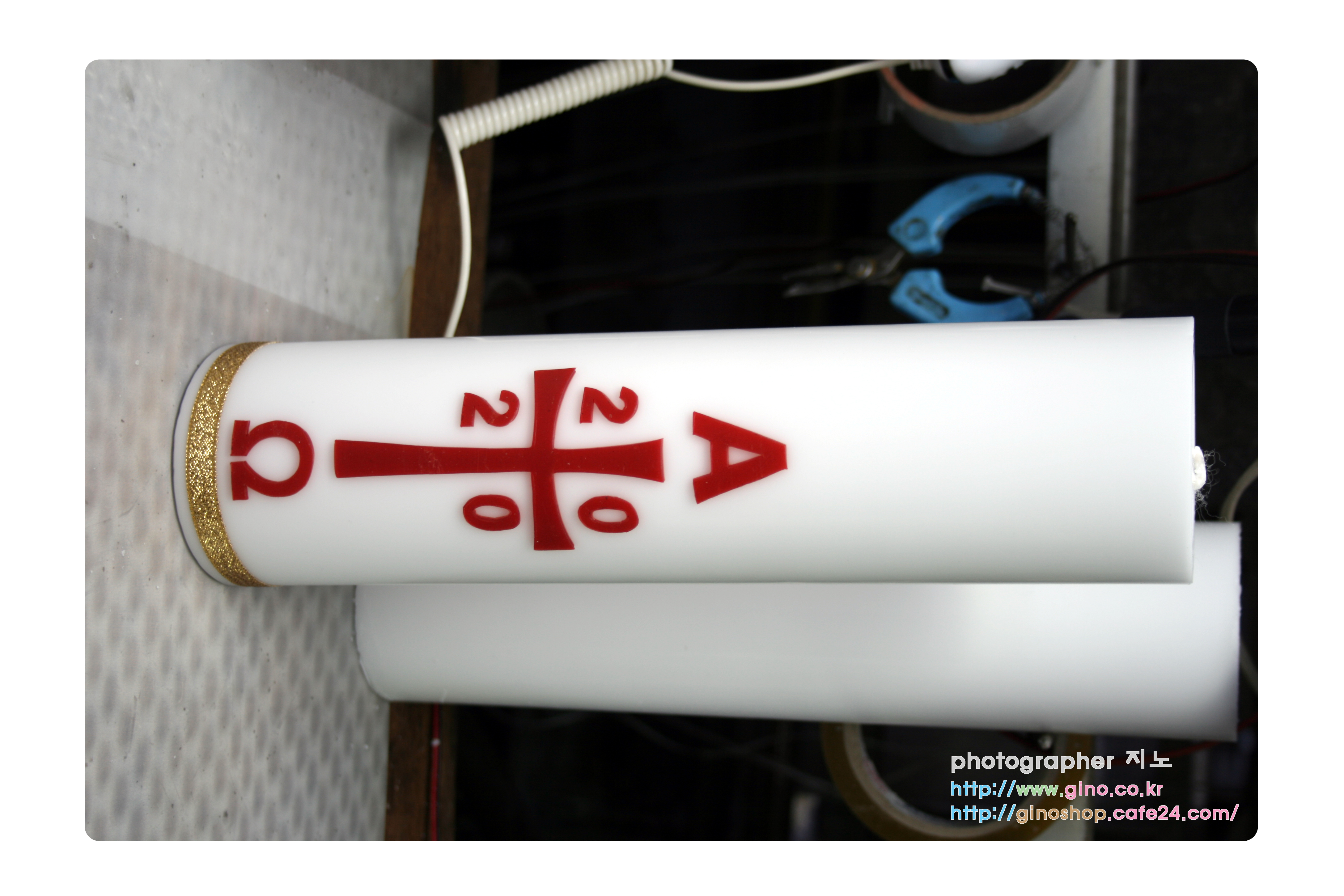 작년에는 부활절때에 인쇄방식의 스타일로 하여 출시를 하였지만 다른 성당 수녀님께서 전체적으로 돌출되게 해줄수 없냐는 문의 내용을 주셧습니다. 예전 부터 돌출되게 해줄수 없냐는 의견을 주셧지만, 적용을 하지 않고 차후에 언젠가는 적용을 해보겠다는 계획만 잡고 있었습니다. 그러나 이번 2020년 제대용 부활초 ver2 제품에는 반영을 하여 매년 마다 년도 수만 다르게 적용하여 출시를 할려고 합니다. 그리고 미니 오상도 끼울수 있도록 적용시켜 볼려고 합니다. 샘플 양초 작업인 밑바탕인 전체 적인 배치 위치와 글씨 포인트 및 구도 조정을 도안으로 잡음 다음 초에 붙여서 종이 시안으로 육안으로 확인후 하나씩 하나씩 준비를 해나갑니다. 그런 다음 적색 캔들 왁스 시트에 손으로 컷팅 작업으로 샘플 만들기에 착수를 합니다.