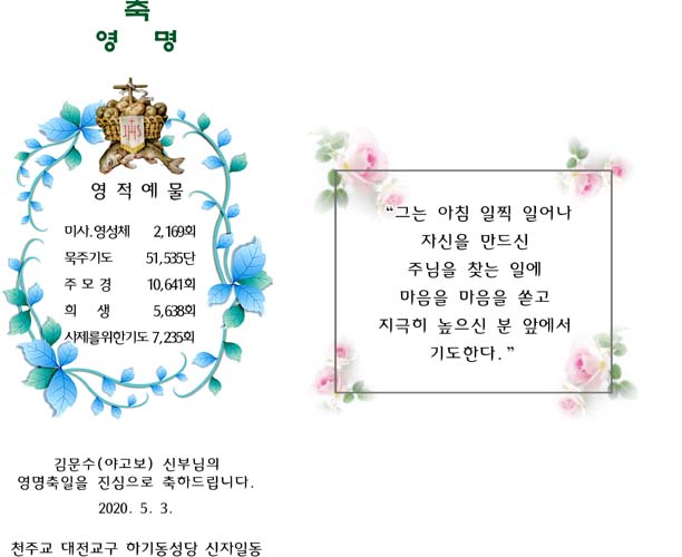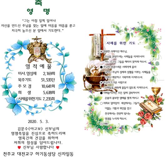 김문수(야고보) 신부님의 영명축일을 진심으로 축하드리며 영육간의 건강을 위하여 저희의 정성을 담아드립니다. ♥ 신부님 사랑합니다 ♥ 천주교 대전교구 하기동성당 신자일동