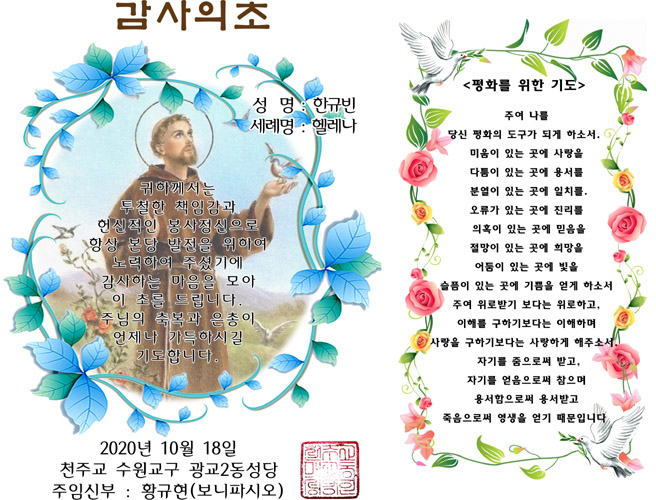 <평화를 위한 기도> 주여 나를 당신 평화의 도구가 되게 하소서. 미움이 있는 곳에 사랑을 다툼이 있는 곳에 용서를 분열이 있는 곳에 일치를. 오류가 있는 곳에 진리를 의혹이 있는 곳에 믿음을 절망이 있는 곳에 희망을 어둠이 있는 곳에 빛을 슬픔이 있는 곳에 기쁨을 얻게 하소서 주여 위로받기 보다는 위로하고, 이해를 구하기보다는 이해하며 사랑을 구하기보다는 사랑하게 해주소서. 자기를 줌으로써 받고, 자기를 얻음으로써 참으며 용서함으로써 용서받고 죽음으로써 영생을 얻기 때문입니다