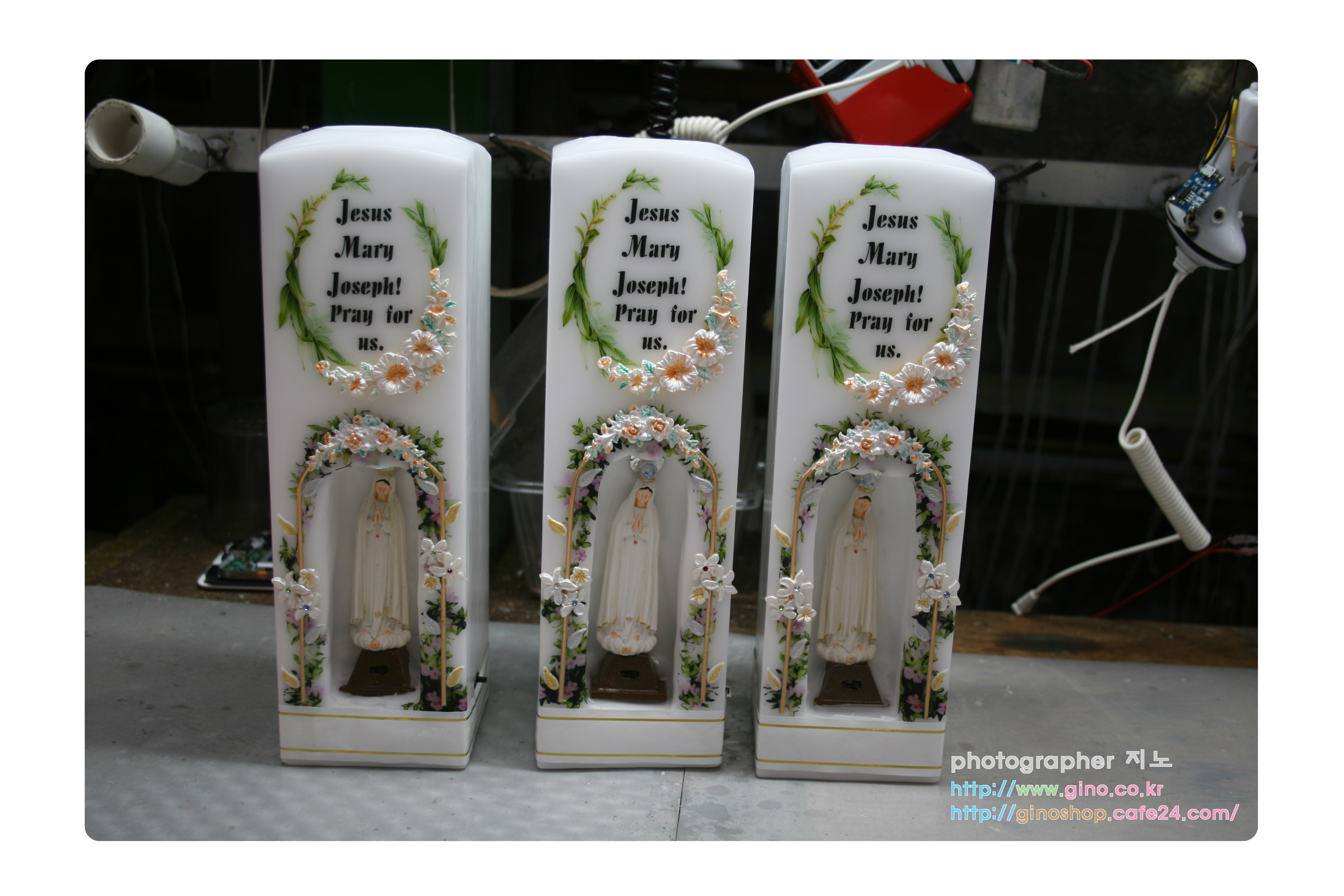 선물용으로 주문 제작을 하신 jesus mary joseph pray for us 파티마성모 led 양초 캔들 입니다.