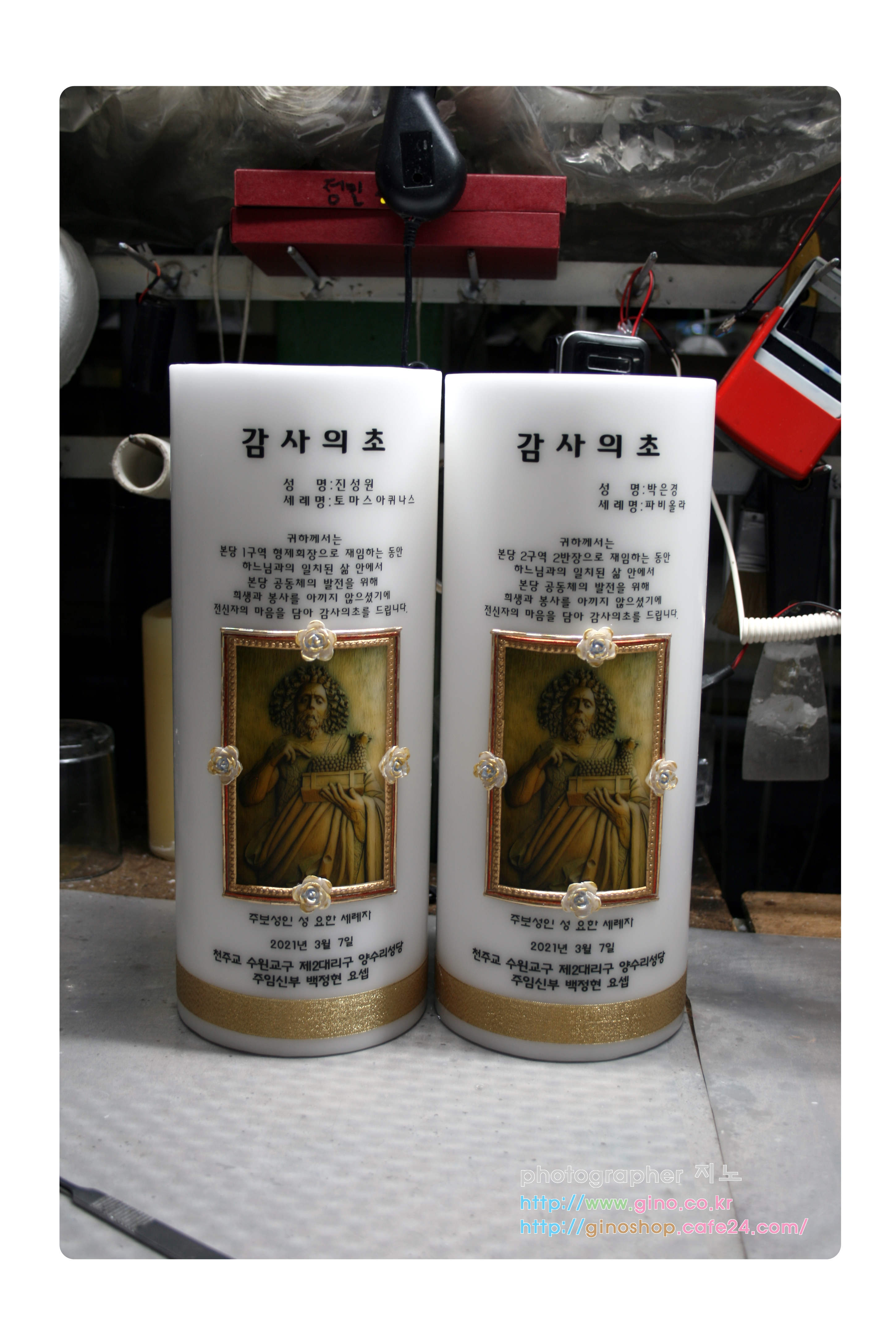 양수리성당에서 그동안 본당의 수고한 노고의 감사의 내용을 담아 주문 제작을 하신 양초 캔들입니다.