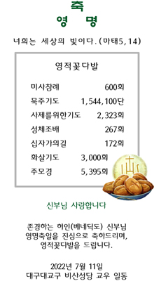 미사참례 600회 묵주기도 1,544,100단 사제를위한기도 2,323회 성체조배 267회 십자가의길 172회 화살기도 3,000회 주모경 5,395회