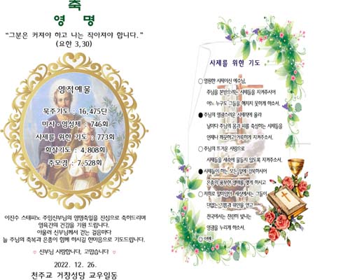 이진수 스테파노 주임신부님의 영명축일을 진심으로 축하드리며 영육간의 건강을 기원 드립니다. 아울러 신부님께서 걷는 걸음마다 늘 주님의 축복과 은총이 함께 하시길 한마음으로 기도드립니다. ♡ 신부님 사랑합니다, 고맙습니다 ♡