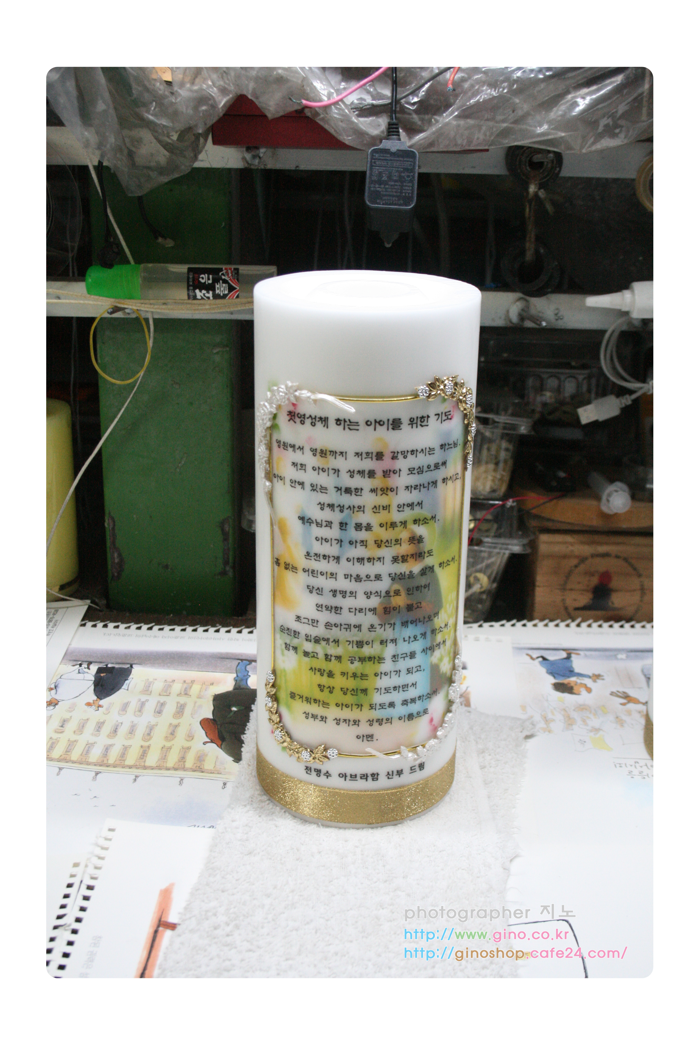 전신부님께서 첫영성체 선물로 고급지게 만들어갈라고 주문 제작을 으뢰하신 양초 캔들입니다.