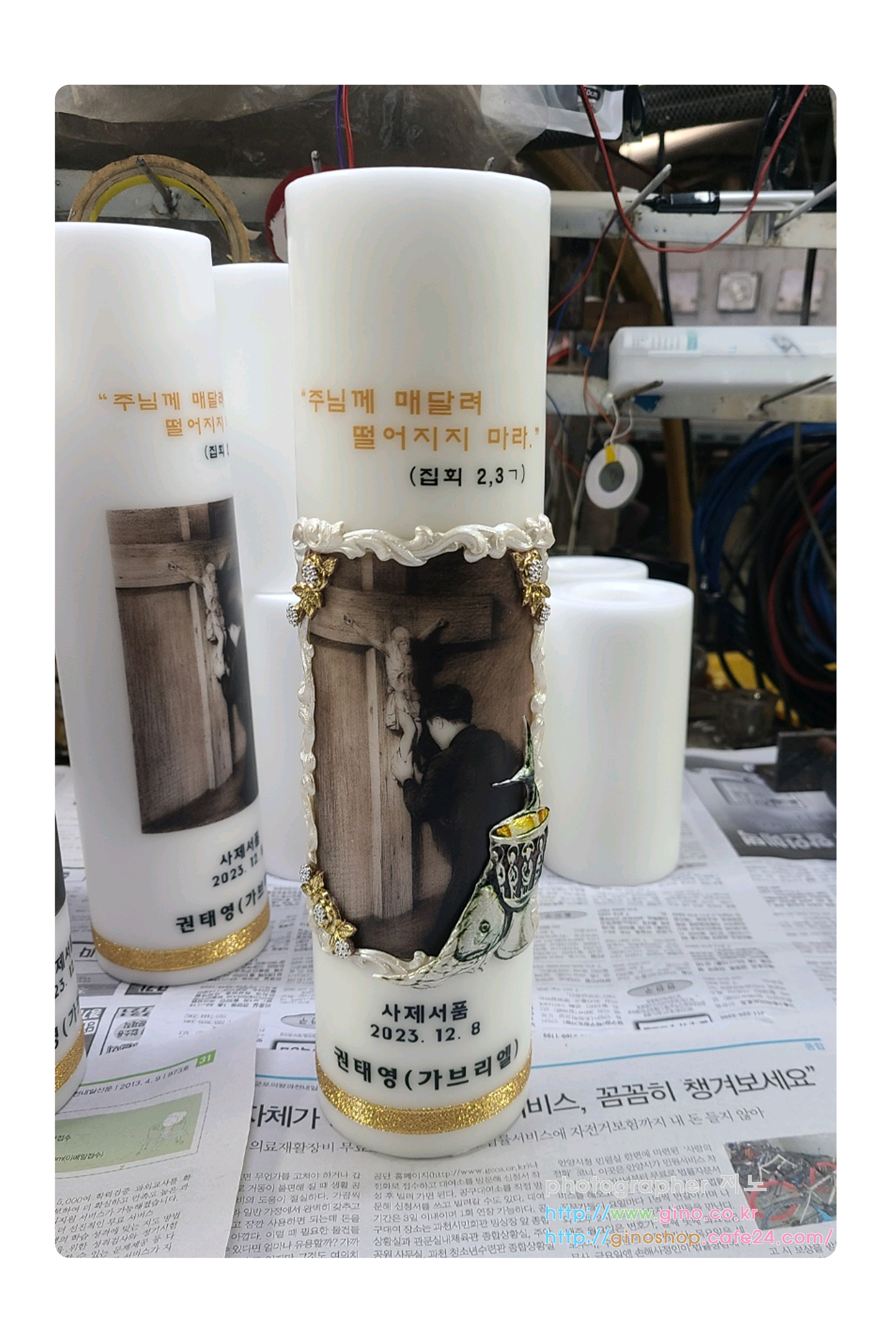새롭게 디자인하여 만들어본 견본 세제서품 양초 샘플이 완성이 되었습니다. 이번에 수원교구 사제서품 하시는 부제서품 제대용 장식초가 의뢰가 들어와서 이참에 새롭게 만들어본 장식도 적용하여 upgrade 적용을 해봅니다. 각 단체별 사제서품식때 사용되는 초를 요 디자인과 아니면 예전 디자인중 선택을 해서 원하시는 쪽으로 만들어 드릴것입니다.