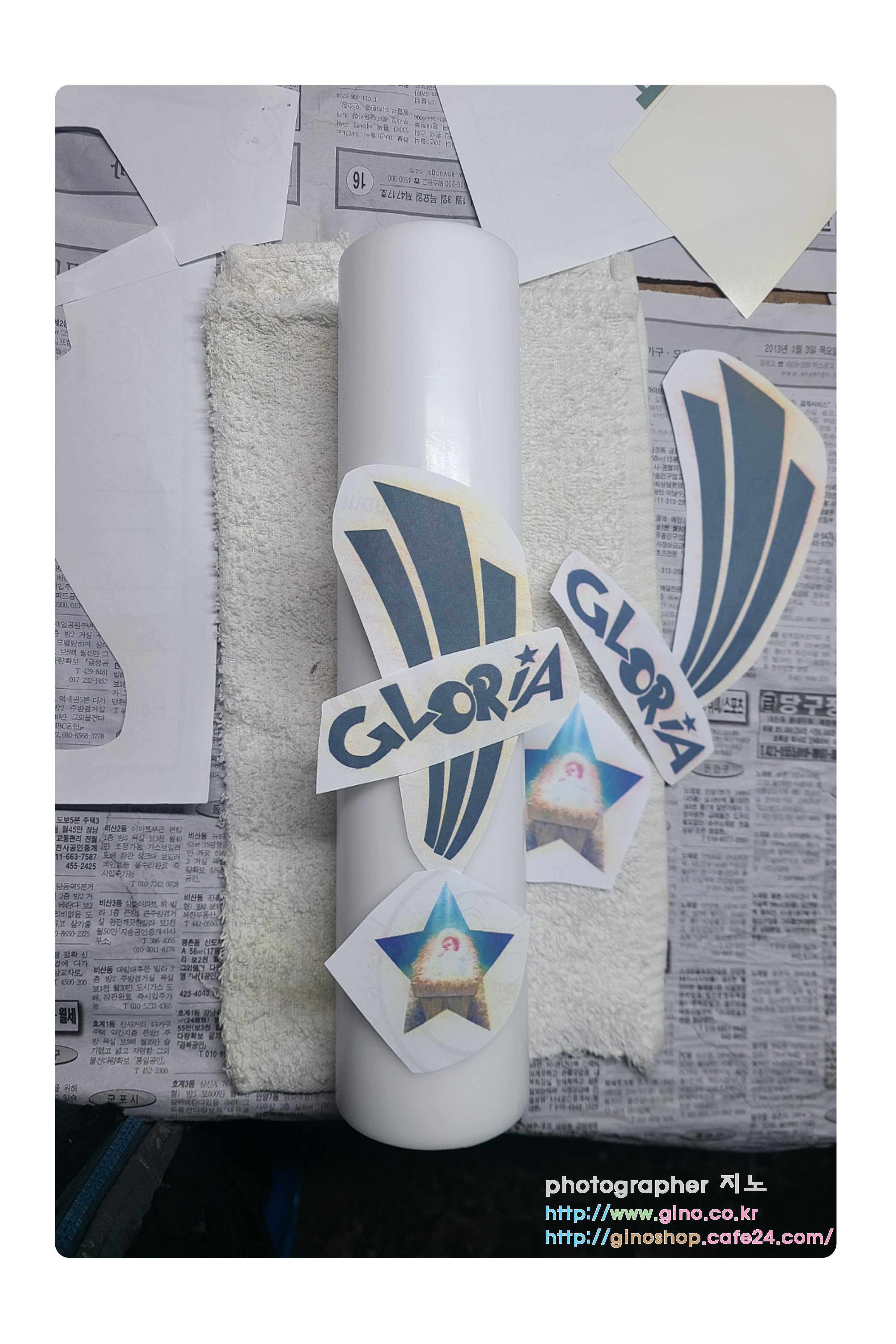 준비된 제료를 초에 다 붙인 사진입니다. 이제 적색 캔들 왁스시트로 딴 글로리아 글씨만 붙이면 완성이 됩니다.