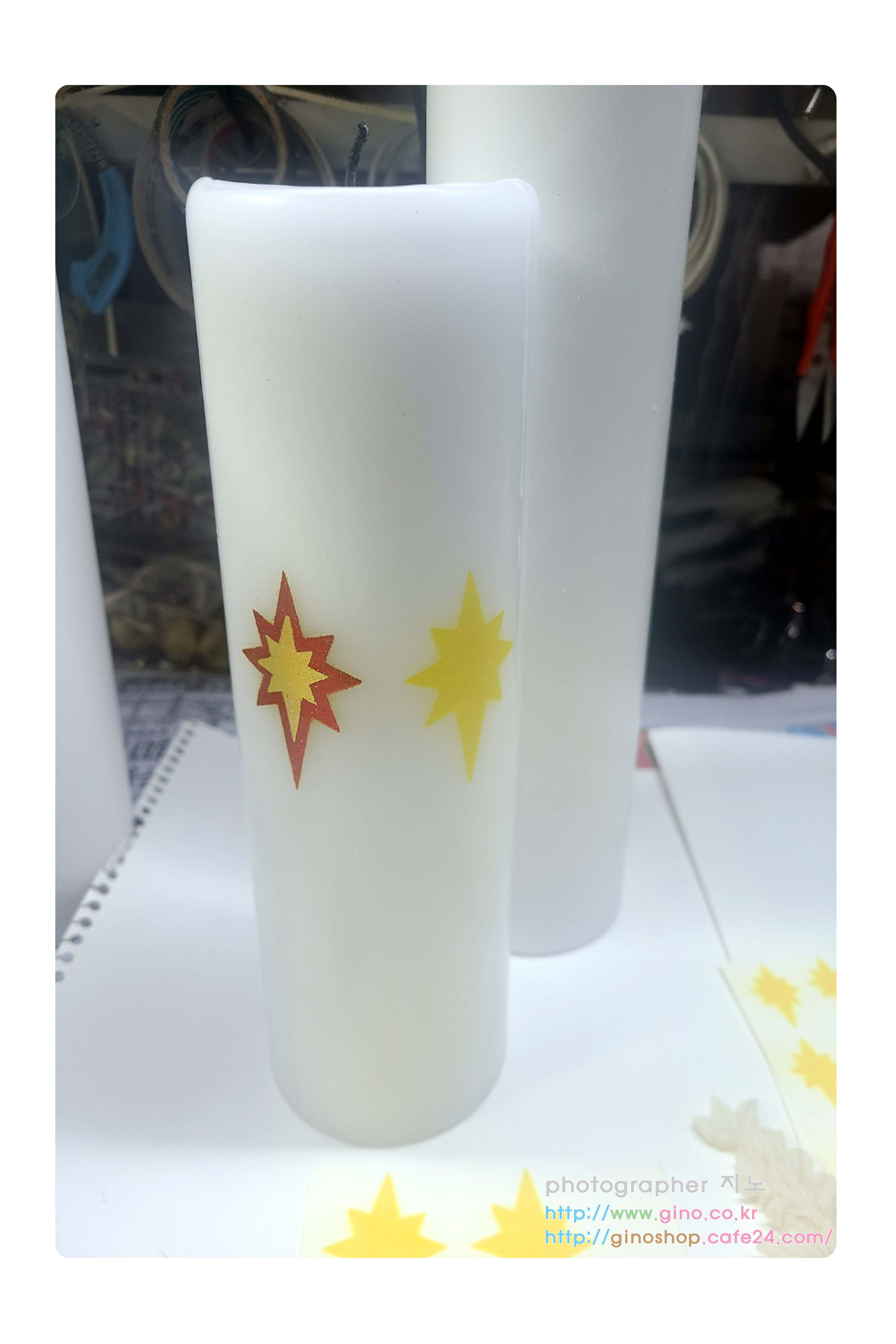 양초에 붙여질 모양은 이번에 새로 구입한 몰드로 뽑은 트리 모양의 꽃조각을 적용을 시킬려고 하며, 또한 uv인쇄기로 프링팅하여 테스트 중입니다. uv잉크는 이번에 처음 사용해 보기때문에 아직 그 성질을 파악하고 있습니다. 인쇄를 하면 약간 두께감이 있게 인쇄가 되어서 참 신기합니다. 테스트 용으로 초에 별 부분을 적박과 금박으로 붙여보니 아직 적응중이라 상품 퀄리티는 떨어지지만, 지금까지 활용하지 않은 방법으로 적응중이라 활용도가 높다고 생각을 합니다. 샘플로 이 성탄 별을 했지만, 디자인의 별은 다른것으로 알아보고 있는중이라 결정이 되면 새로 update할려고 합니다. 그리고 별 테두리주변에는 은박 캔들 왁스 시트로 테두리 포인트 작업과 글로리아 글씨의 배치는 구성하면서 보고 넣을지를 선택이 될듯합니다.
