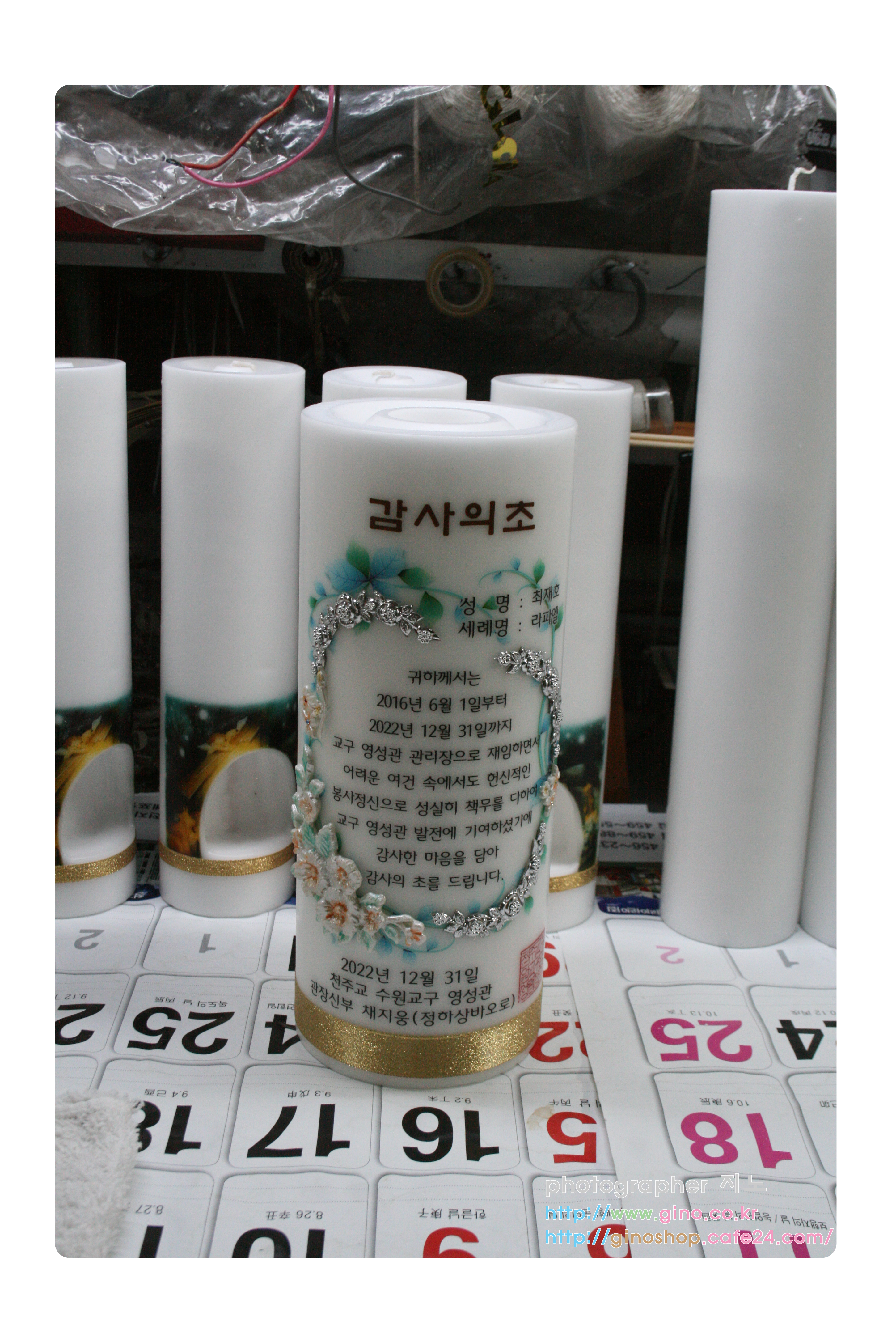 수원교구 영성관에서 교구 영성관 관리장으로 헌신적으로 성실히 책무를 다하여 노력해 주신 노고에 감사의 내용을 담아 주문 제작을 하신 감사의초 양초 캔들 입니다.