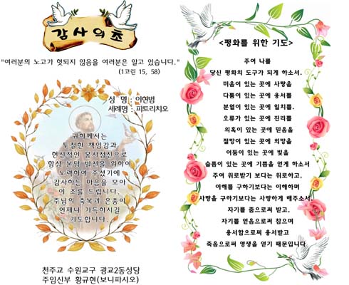 <평화를 위한 기도> 주여 나를 당신 평화의 도구가 되게 하소서. 미움이 있는 곳에 사랑을 다툼이 있는 곳에 용서를 분열이 있는 곳에 일치를. 오류가 있는 곳에 진리를 의혹이 있는 곳에 믿음을 절망이 있는 곳에 희망을 어둠이 있는 곳에 빛을 슬픔이 있는 곳에 기쁨을 얻게 하소서 주여 위로받기 보다는 위로하고, 이해를 구하기보다는 이해하며 사랑을 구하기보다는 사랑하게 해주소서. 자기를 줌으로써 받고, 자기를 얻음으로써 참으며 용서함으로써 용서받고 죽음으로써 영생을 얻기 때문입니다