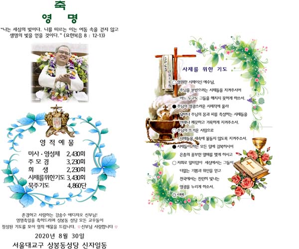존경하고 사랑하는 강송수 에디지오 신부님! 영명축일을 축하드리며 상봉동 성당 모든 교우들이 정성된 기도를 모아 영적예물을 드립니다. ♡ 신부님 사랑합니다 ♡