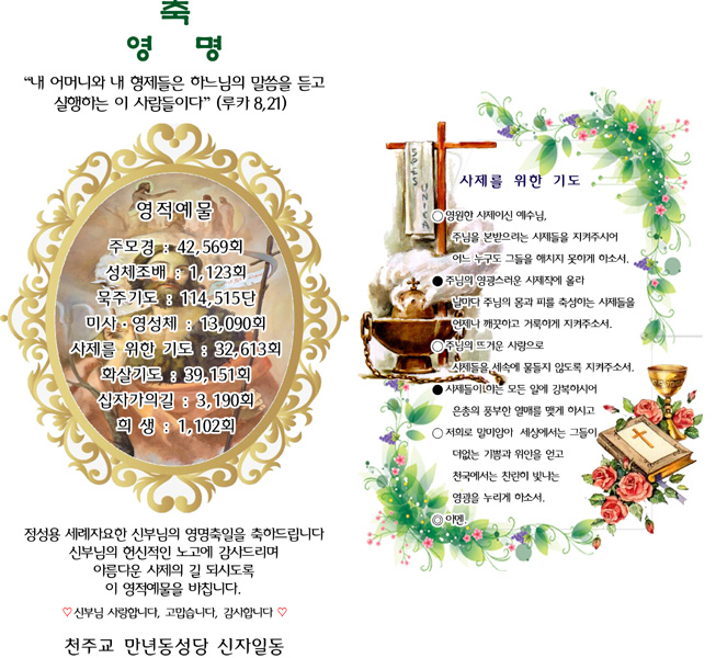 미 사 96회 영 성 체 884회 주 모 송 2,402회 사제를위한기도 2,211회 묵주기도 9,838단 희 생 339회 선 행 534회 화살기도 1,004회