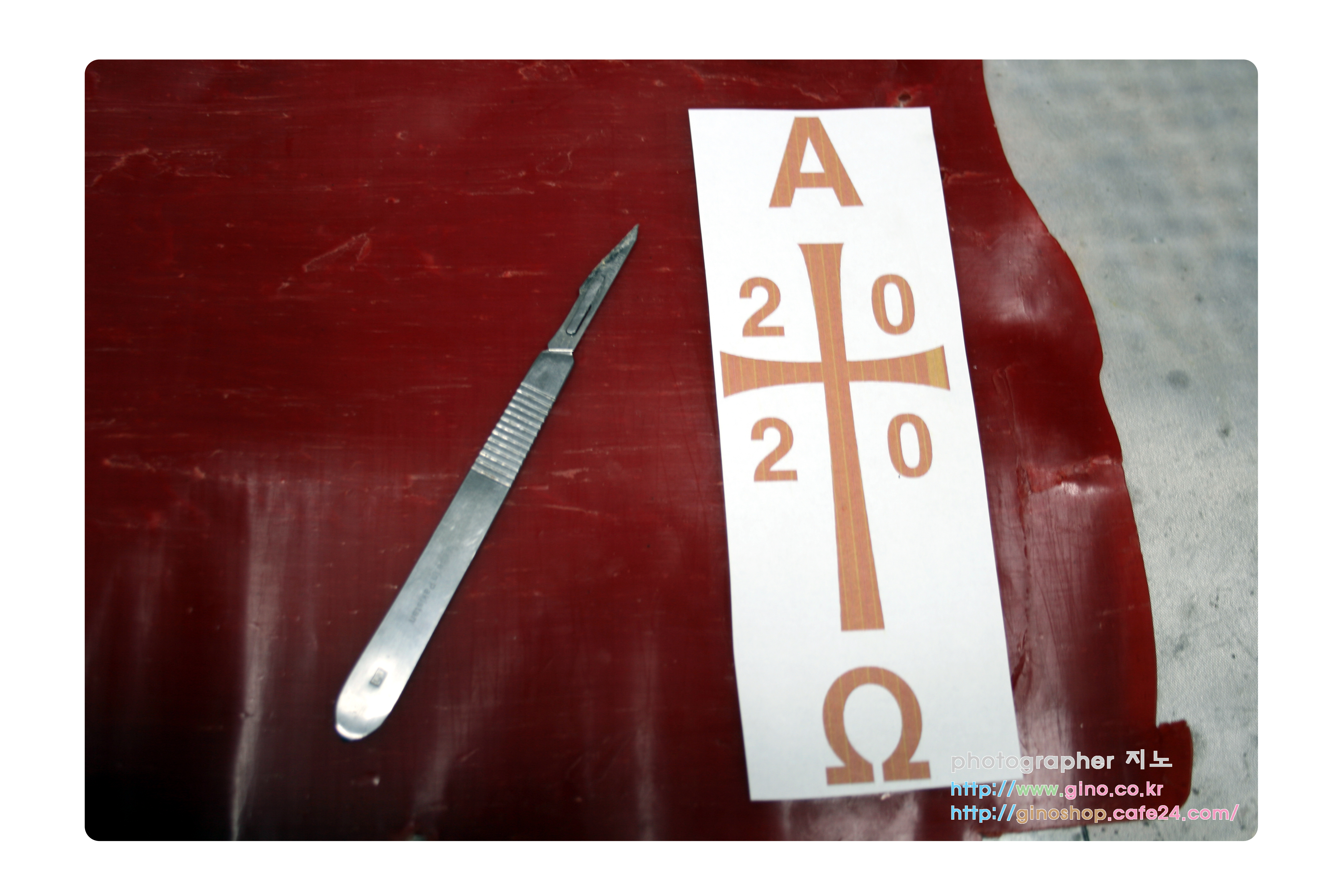 작년에는 부활절때에 인쇄방식의 스타일로 하여 출시를 하였지만 다른 성당 수녀님께서 전체적으로 돌출되게 해줄수 없냐는 문의 내용을 주셧습니다. 예전 부터 돌출되게 해줄수 없냐는 의견을 주셧지만, 적용을 하지 않고 차후에 언젠가는 적용을 해보겠다는 계획만 잡고 있었습니다. 그러나 이번 2020년 제대용 부활초 ver2 제품에는 반영을 하여 매년 마다 년도 수만 다르게 적용하여 출시를 할려고 합니다. 그리고 미니 오상도 끼울수 있도록 적용시켜 볼려고 합니다. 샘플 양초 작업인 밑바탕인 전체 적인 배치 위치와 글씨 포인트 및 구도 조정을 도안으로 잡음 다음 초에 붙여서 종이 시안으로 육안으로 확인후 하나씩 하나씩 준비를 해나갑니다. 그런 다음 적색 캔들 왁스 시트에 손으로 컷팅 작업으로 샘플 만들기에 착수를 합니다.