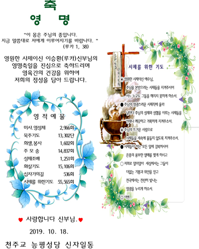 | 이수환(도미니코)신부님 사제서품 1주년 기념 캔들 (0) | 2019.09.15 |