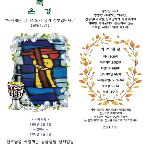 사제서품25주년(은경축)과영명축일을 진심으로 축하드리며 영육간의 건강과 주님의 은총이 늘 함께 하시기를 정성된 마음으로 기도드립니다