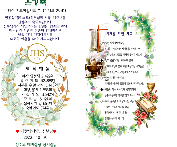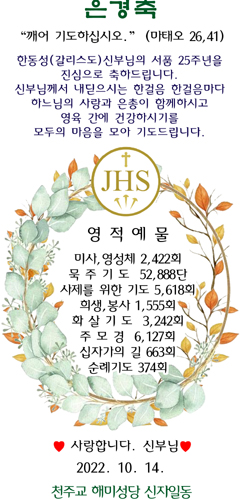 한동성(갈리스도)신부님의 서품 25주년을 진심으로 축하드립니다. 신부님께서 대딛으시는 한걸을 한걸음 마다 하느님의 사랑과 은총이 함게하시고 영육 간에 건강하시기를 모두의 마음을 모아 기도드립니다.