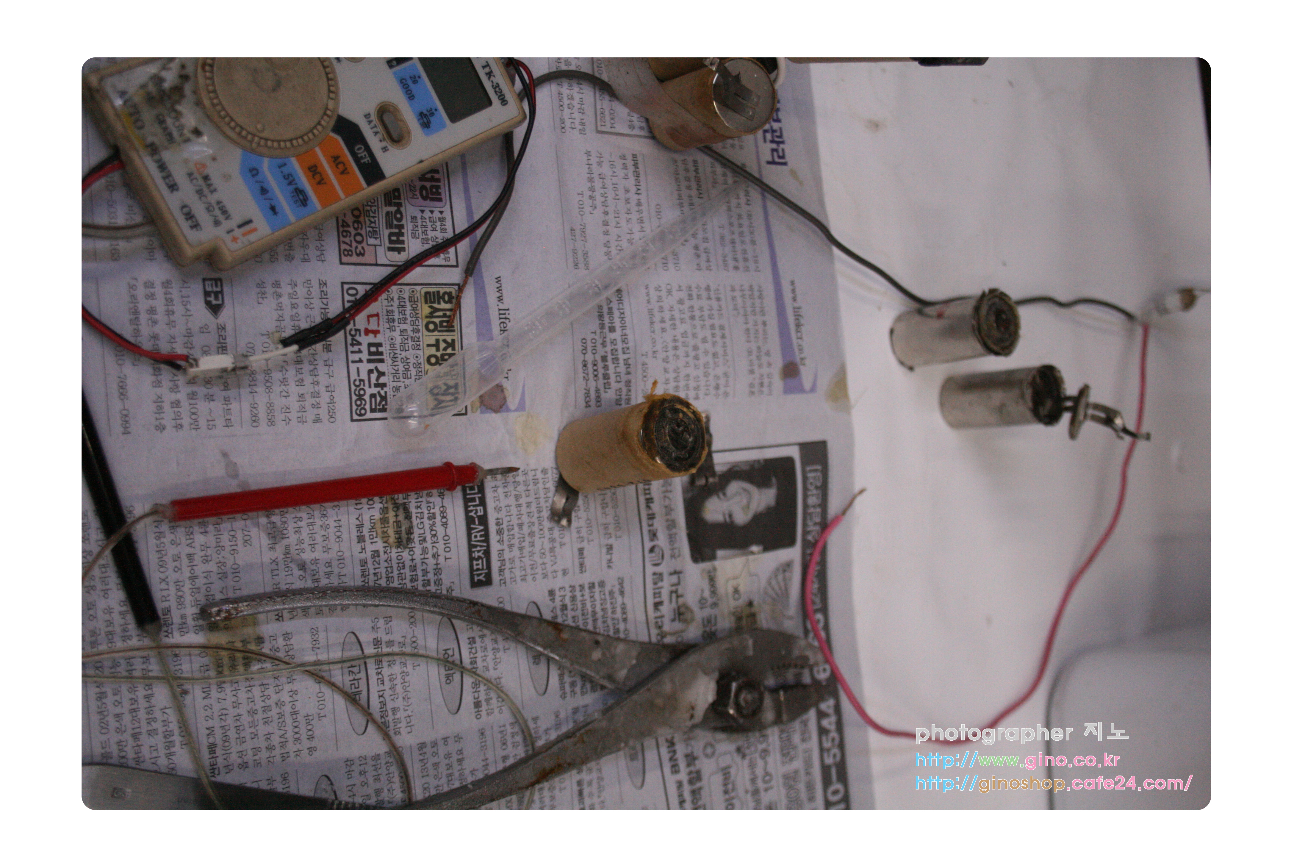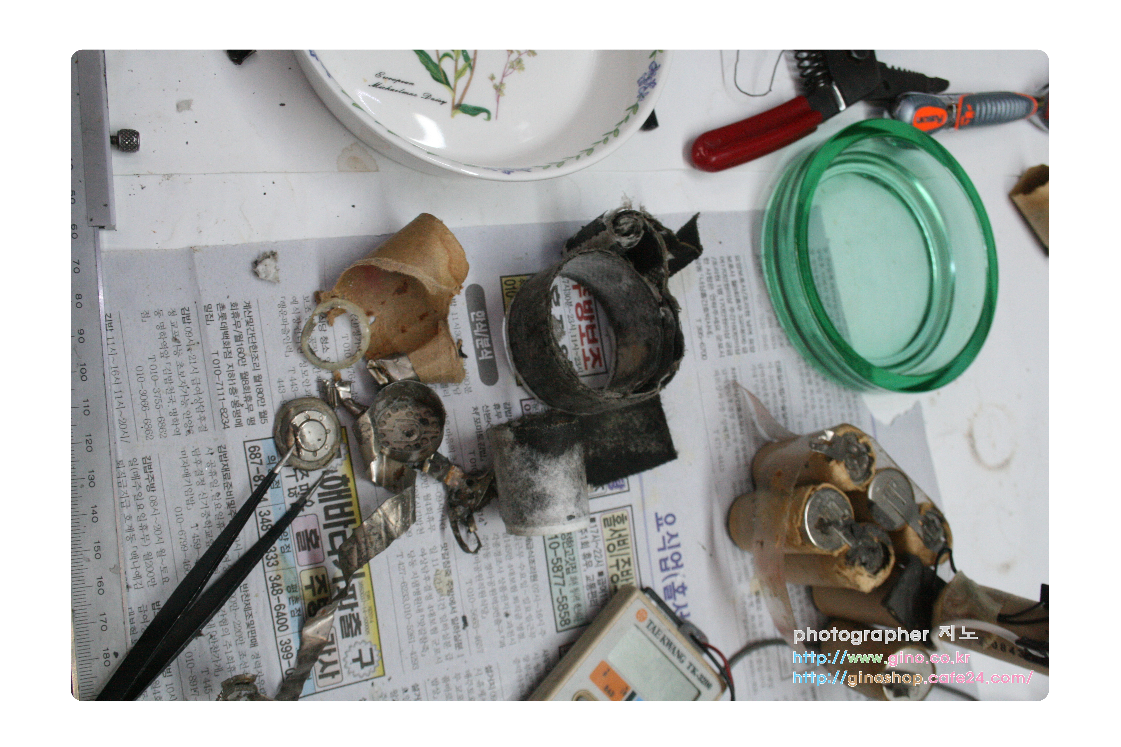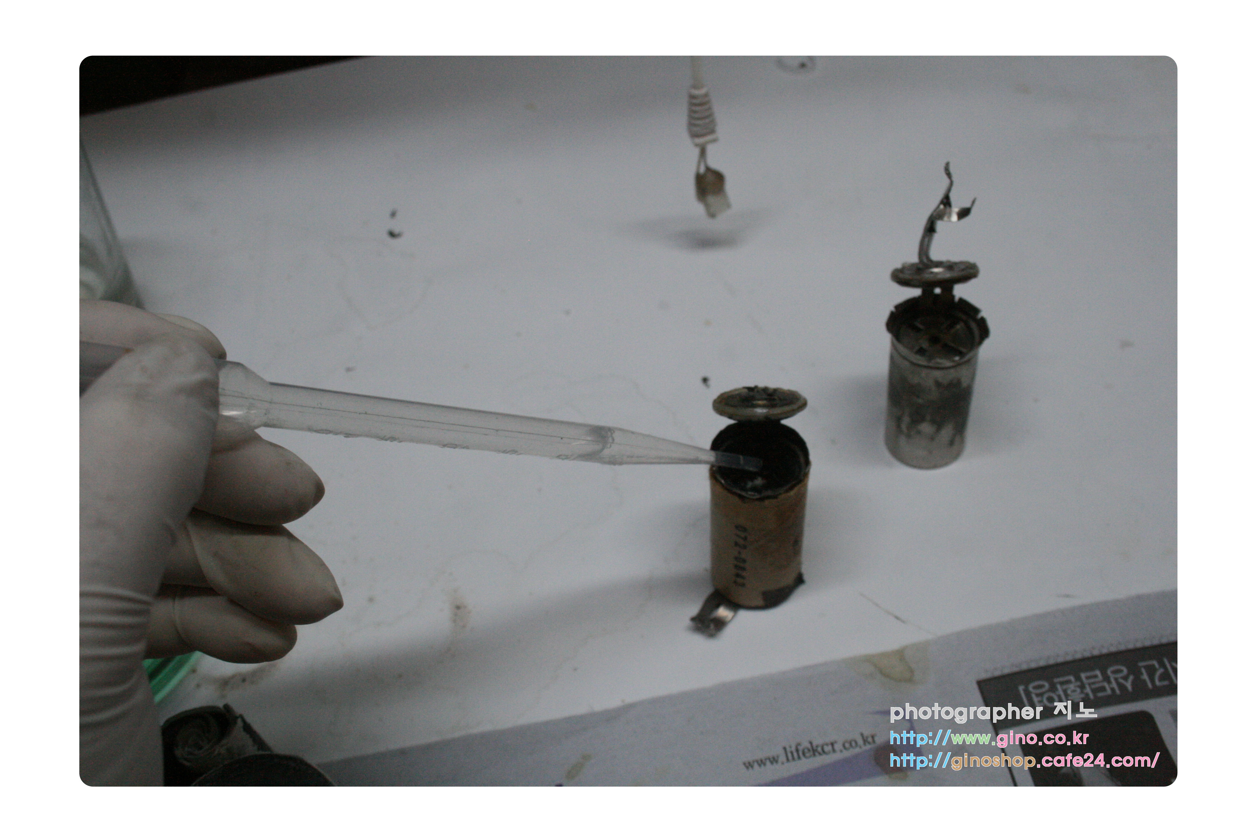 그리고 1개는 뚜따를 안하고 밑 바닥 부분을 드릴로 뚥어서 전해액을 집어 넣는 과정에서 드릴로 뚥으면서 +극성과 -극성이 붙어서 쇼트가 된듯합니다. 안에 내구 구조가 어떻게 되었는지 완전 분해해 본 사진도 올려봅니다.