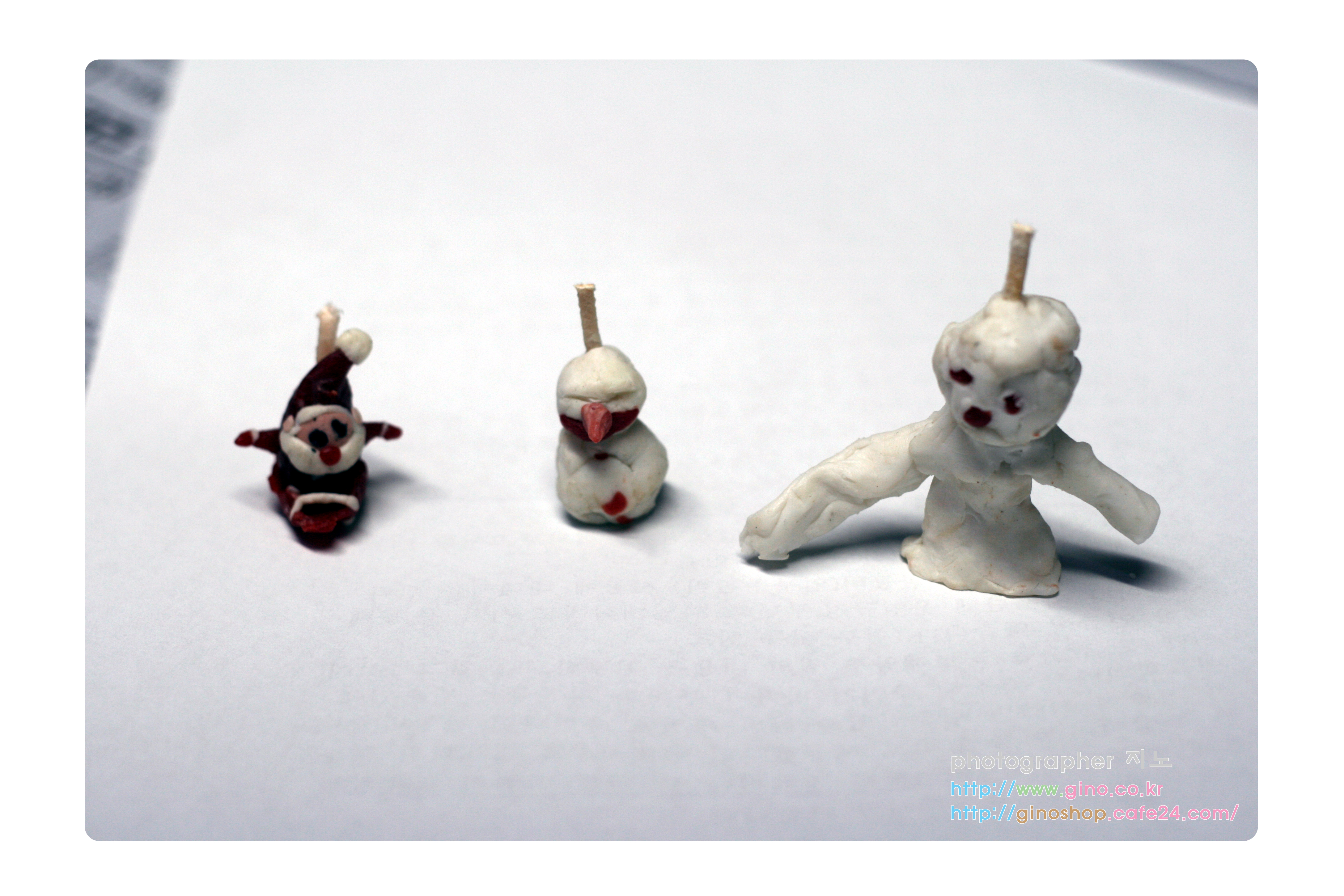양초 장식때 들어가는 색상 왁스 유토를 공장에 놀러온 아이들이 보고 머를 만들어 보고 싶다고 해서 몇가지 색상의 왁스 유토를 주었더니 산타와 눈사람 작품이 탄생을 하였습니다. 그리고 초심지도 달라고 해서 주었더니 머리 위에 꽃더니 세상에 하나뿐인 양초로 재 탄생이 되네요.