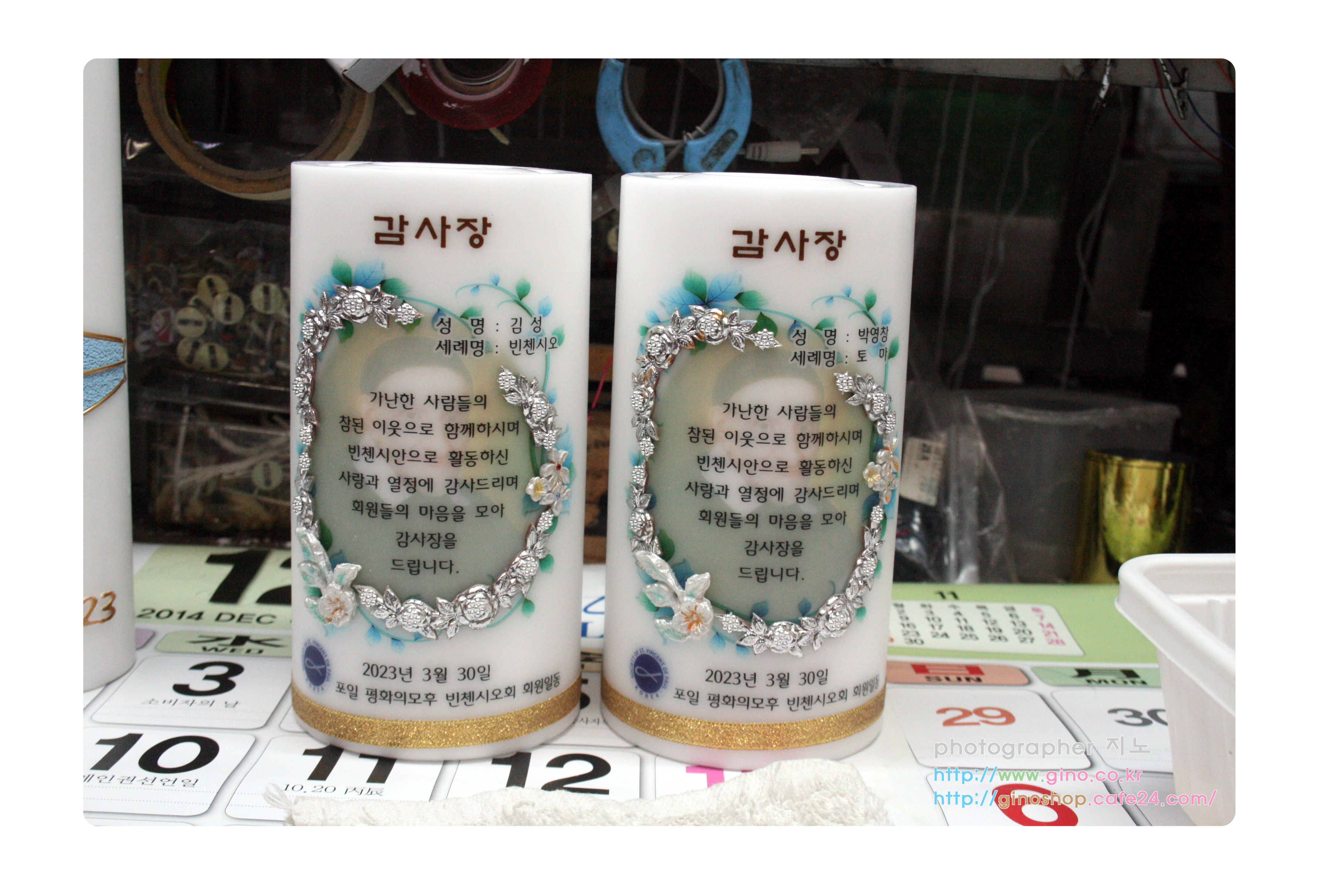 본당 발전과 신앙교육에 희생과 봉사의 헌적의 감사의 내용을 담아 주문 제작을 하신 감사초 양초 캔들 입니다