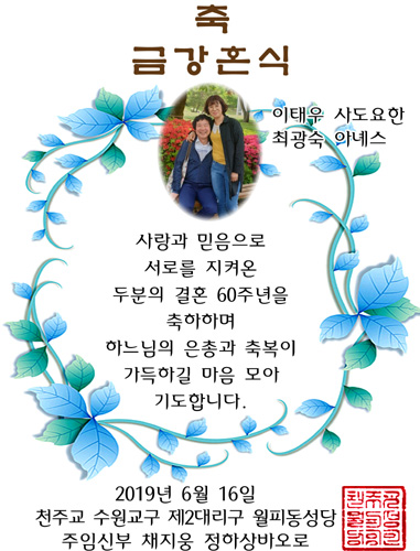 사랑과 신의로 함께한 50주년 발자취에 존경과 감사를 드리고 앞으로 함께할 두분의 발걸음에 하느님의 은총과 축복이 가득하기를 복대동 본당 교우 일동이 마음 모아 기도합니다.