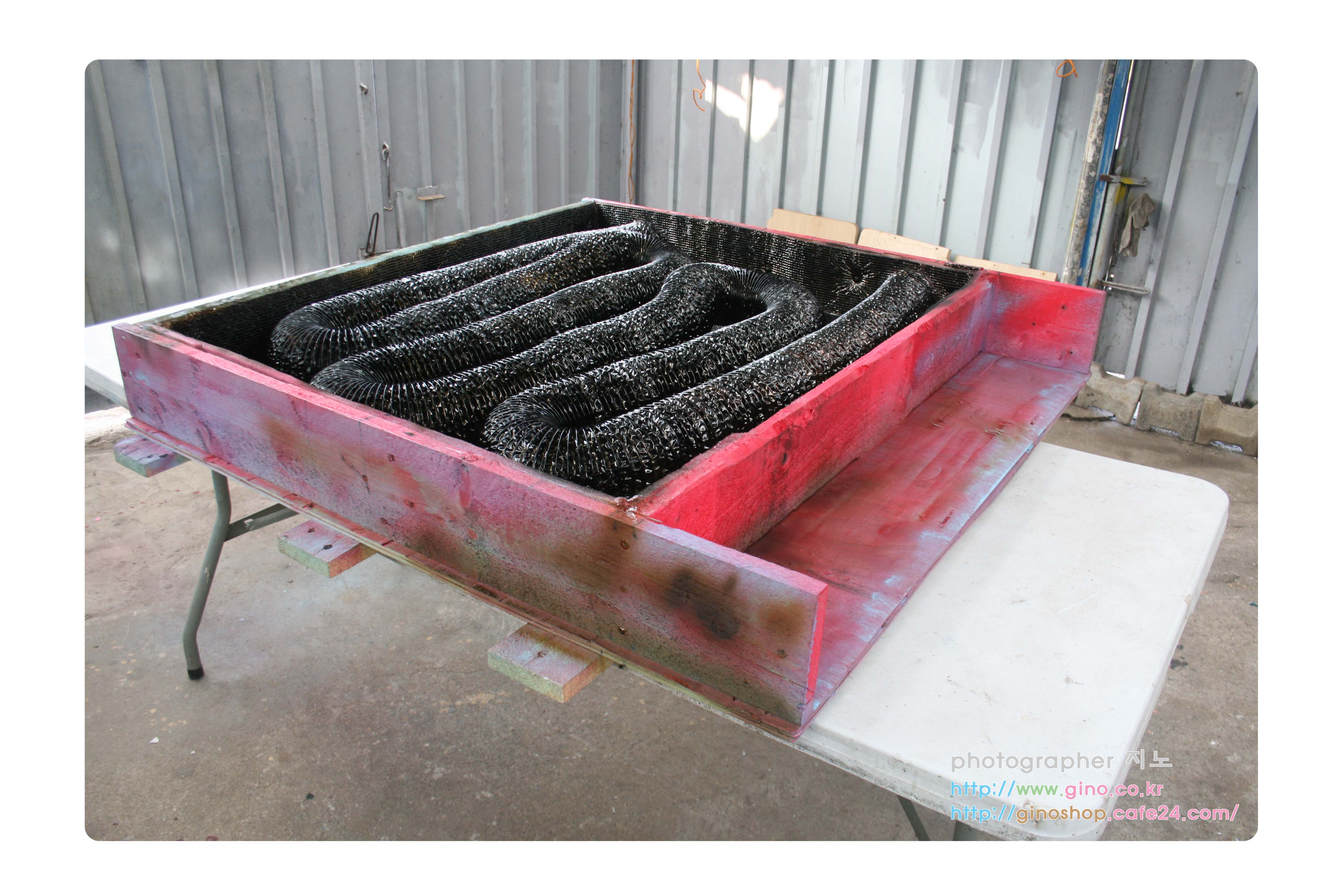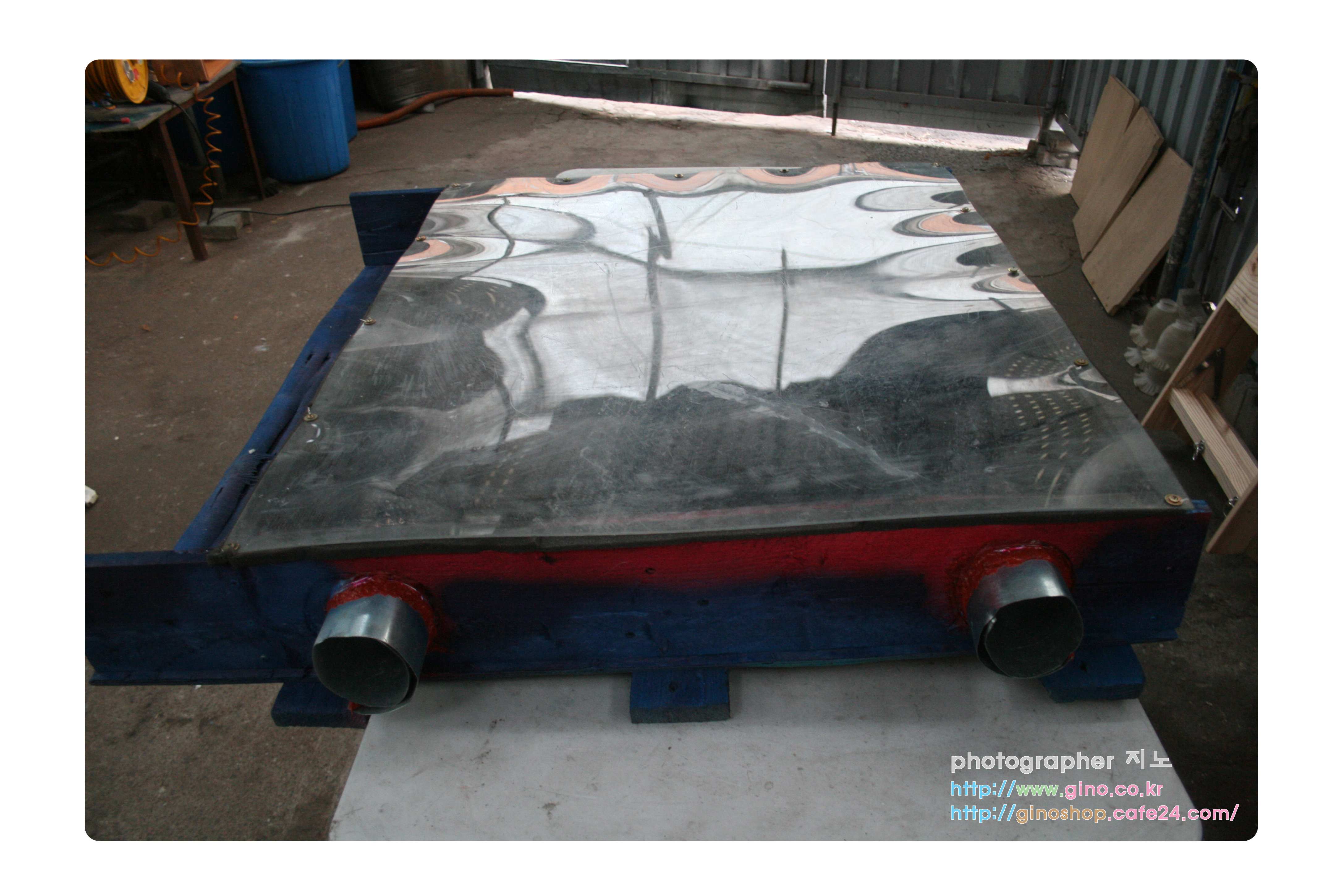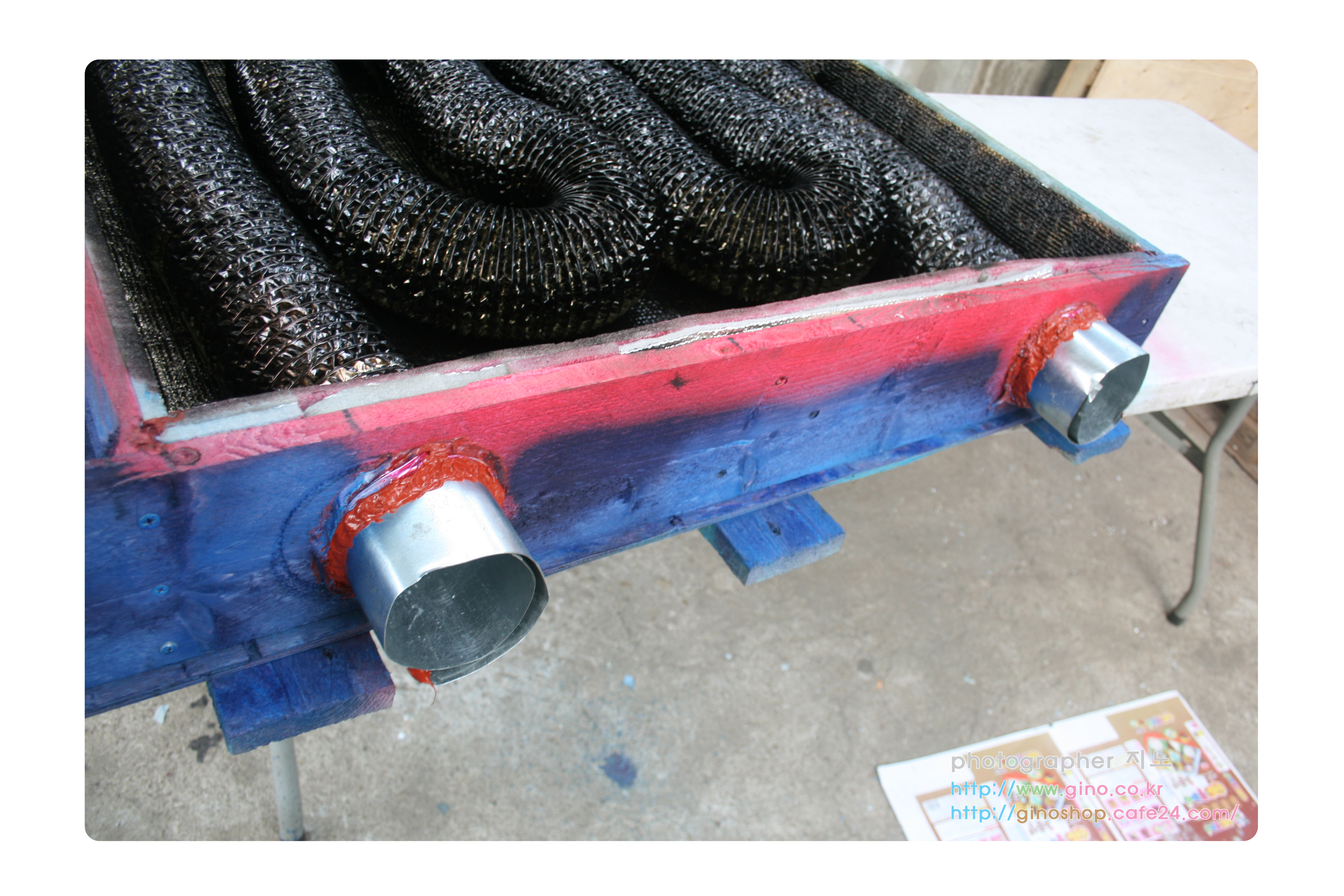 가장 핵심이 되는 프레임 작업에 착수를 합니다. 알루미늄 자바라를 다 풀어서 대략적인 길이와 폭에 맞추어 목재 길이를 절단을 하여 기본틀을 만들어줍니다. 가장 시간이 많이 소요가 되는 과정인듯합니다. 그리고 드릴에 원형톱을 장착을 하여 바람이 들어가고 나가는 배관구멍을 뚤어줍니다. 그리고 단열재를 딸라서 안에 공간에 딱 맞게 재단을 하여 나사로 고정 작업을 해준다음 알루미늄 배관통을 온풍기 안에 넣어서 배관이 약간 나오도록 해둔다음 실리콘으로 모서리 부분을 다 쏘아 줍니다. 그리고 알루미늄 자바라에 검은색으로 도색을 해야 되는데 저 같은 경우는 공장에 우레칸 검정색이 있어서 그걸로 색을 칠해버렸습니다. 원래는 인터넷 보시면 부광 흑색 고열 스프레이라고 있는가봅니다. 그거 구입해서 사용하시면 됩니다. 저 같은 경우는 있는서 사용을 했지만, 차후에 도색면이 들뜨거나하면 다시 뜯어서 재도색 작업을 하면 되기때문에 pass입니다. 참조하시구요. 햇빛 온풍기 작업은 요까지 하고 만들어지는 과정 짬짬히 update하도록하겠습니다.