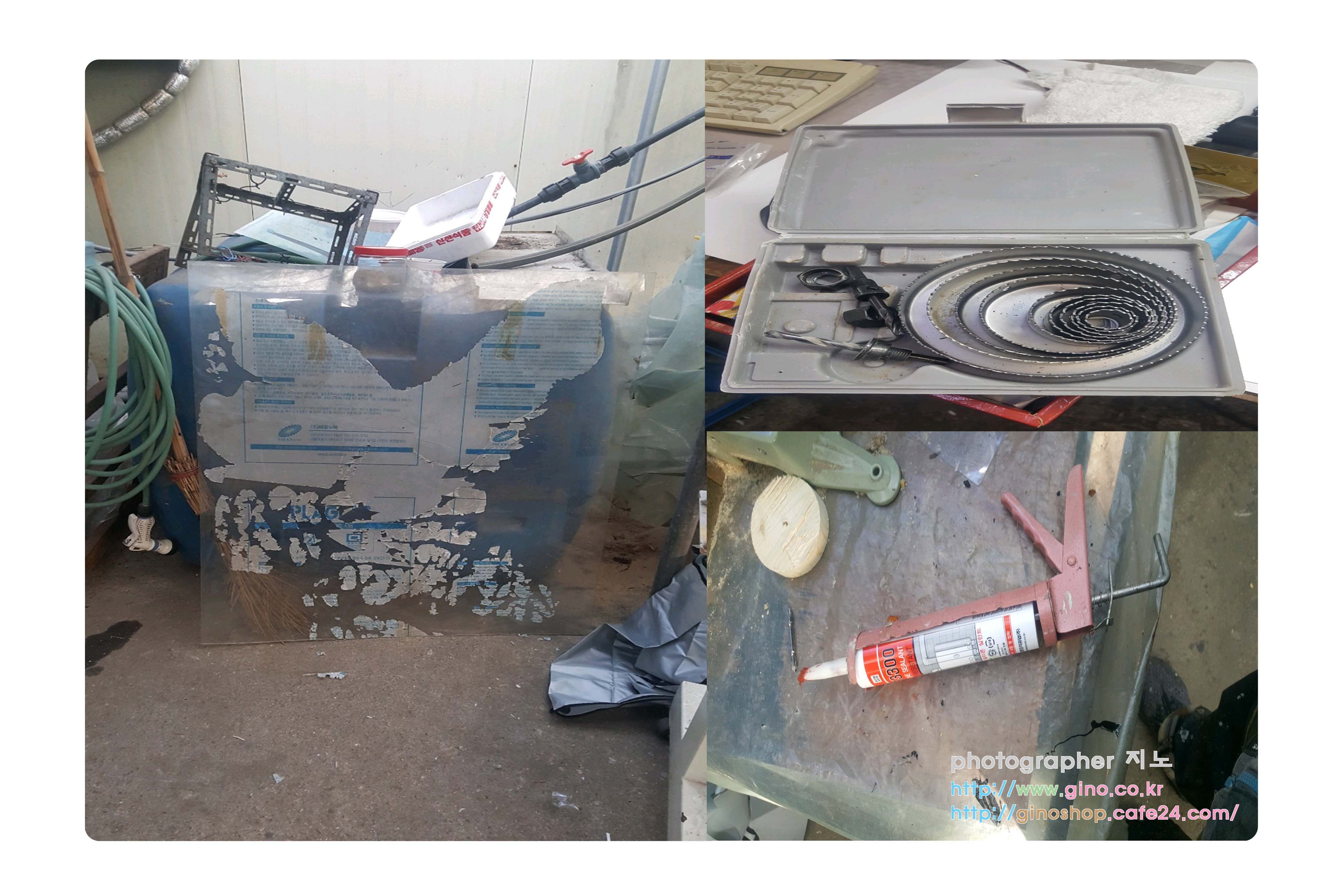 추가로 준비해야할 재료로 온풍기의 커버로 사용해야 하기때문에 고열에도 견딜수 있는폴리카보네이트라는 투명 플라스틱판과 나무 프레임을 원형으로 타공을 할수 있는 원형 칼날을 셋트로 구입을 했습니다. 중국제라 가격이 1만원 내외로 저렴합니다. 그리고 햇빛 온풍기 안쪽의 마감 처리로 내열실리콘도 넉넉하게 2통정도 준비를 해두었습니다.