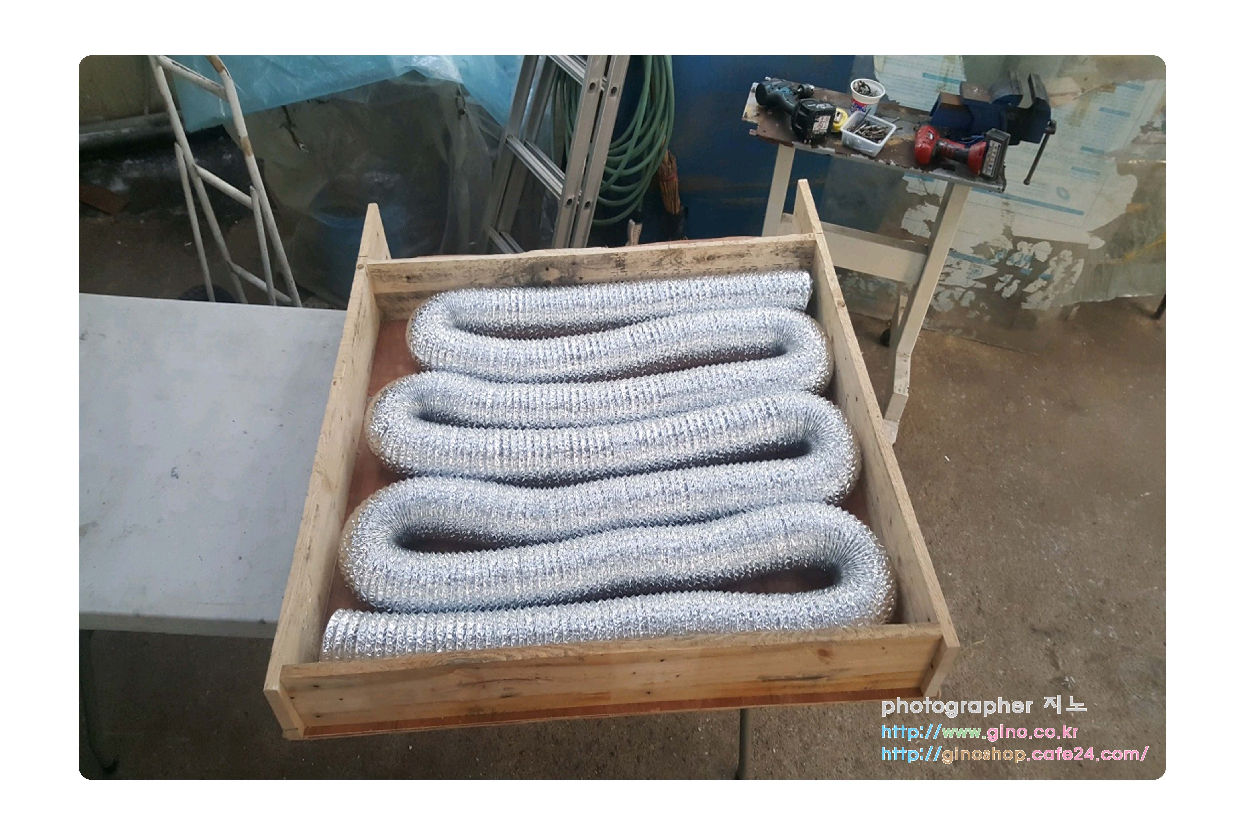 왜 그러냐하면 제가 앞전에 조금이라고 금전적인 부분은 줄이기 위해서 알루미늄 맥주캔이나 음료수 캔을 모아서 위에 구멍을 따고 밑에 구멍을 내어 실리콘으로 접착하여 만들어 보았는데, 재료 수급이 잘 안되어 만들다가만 것입니다. 만들면서 문제될 부분이 일반실리콘을 사용해서는 안되며, 열에 강한 검은색이나 보일러 연통에 바르는 빨강색으로 발라야 되는데 또 잘못 바르면 바람이 셀수도 있어 효율적 및 문제가 생길뿐만 아니라 작업 효율성 시간등을 따지고 보면 알루미늄 자바라로 만드는게 시간 및 작업성 부분에서 좋습니다.