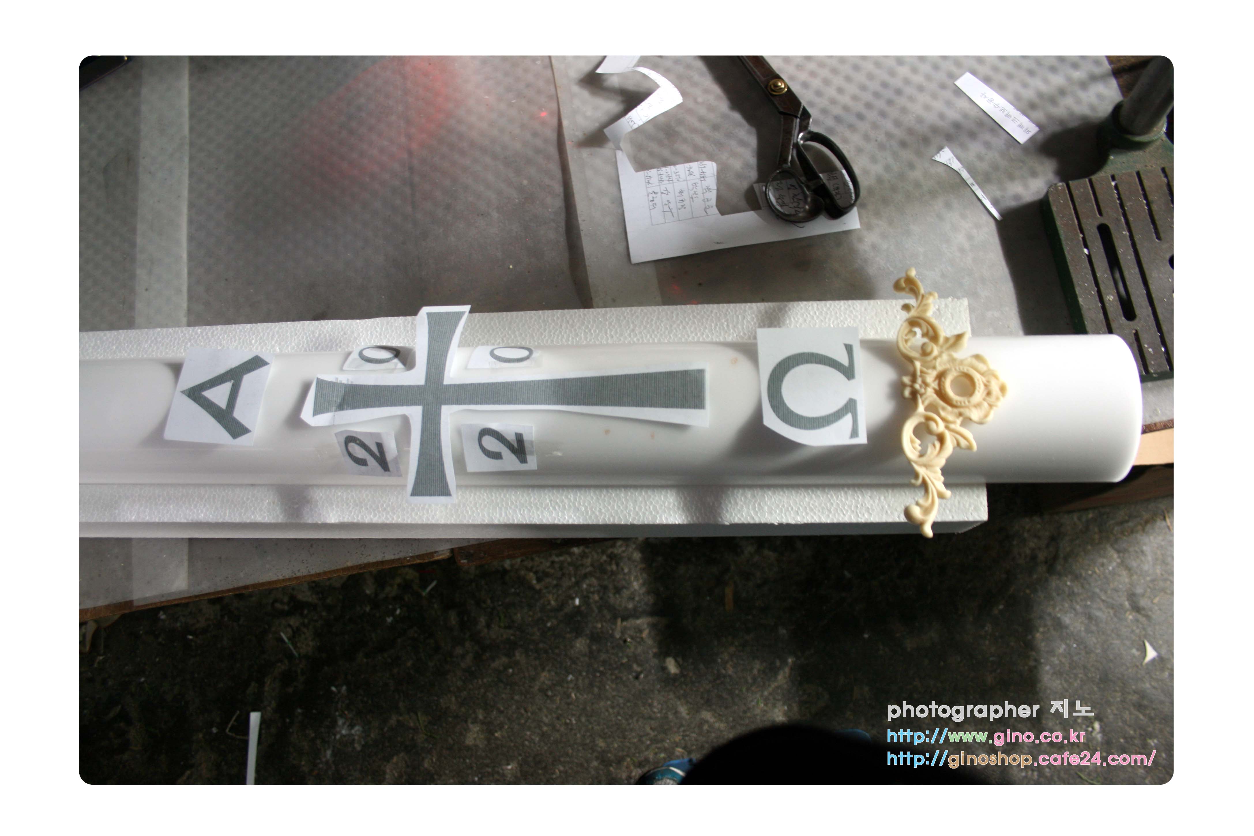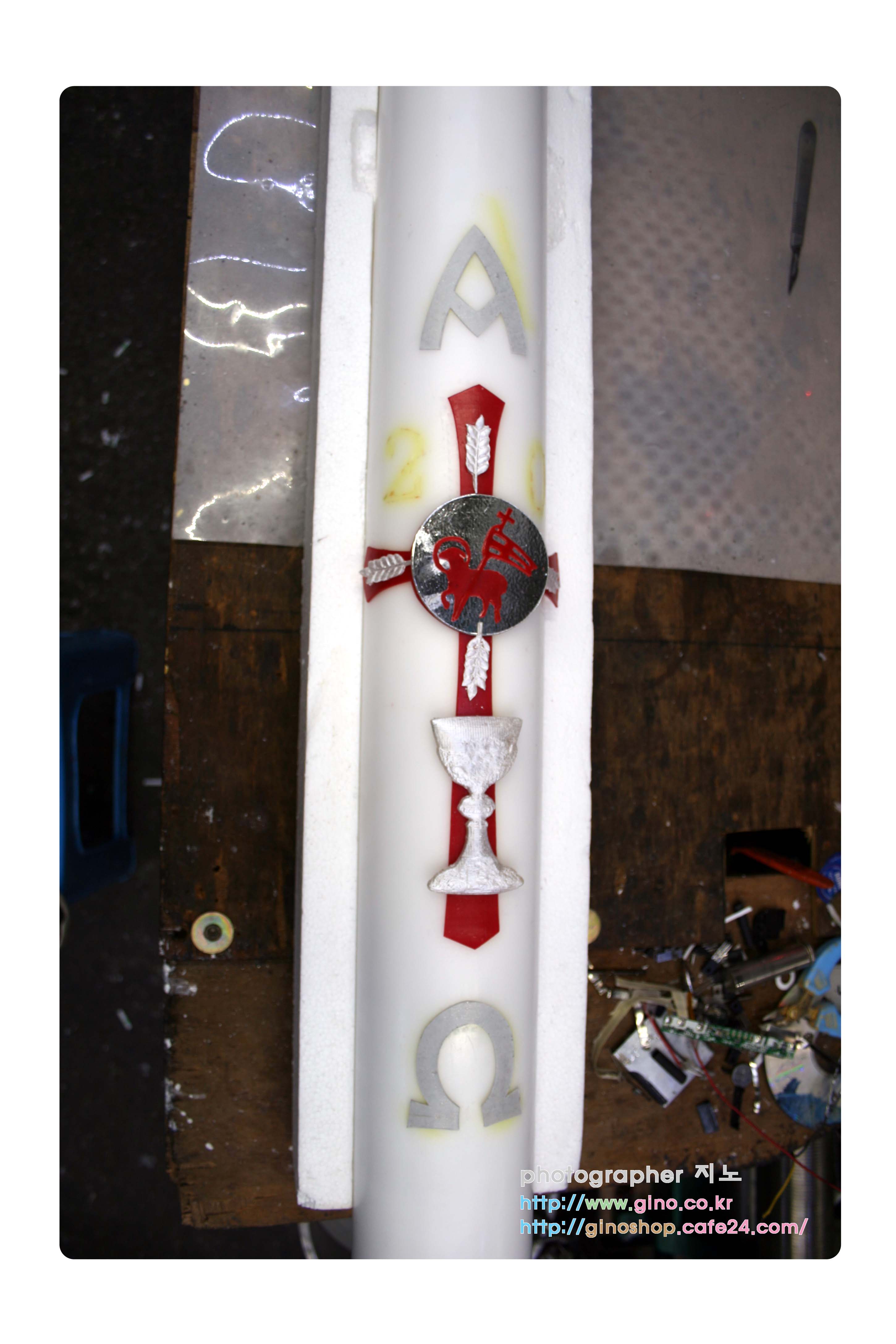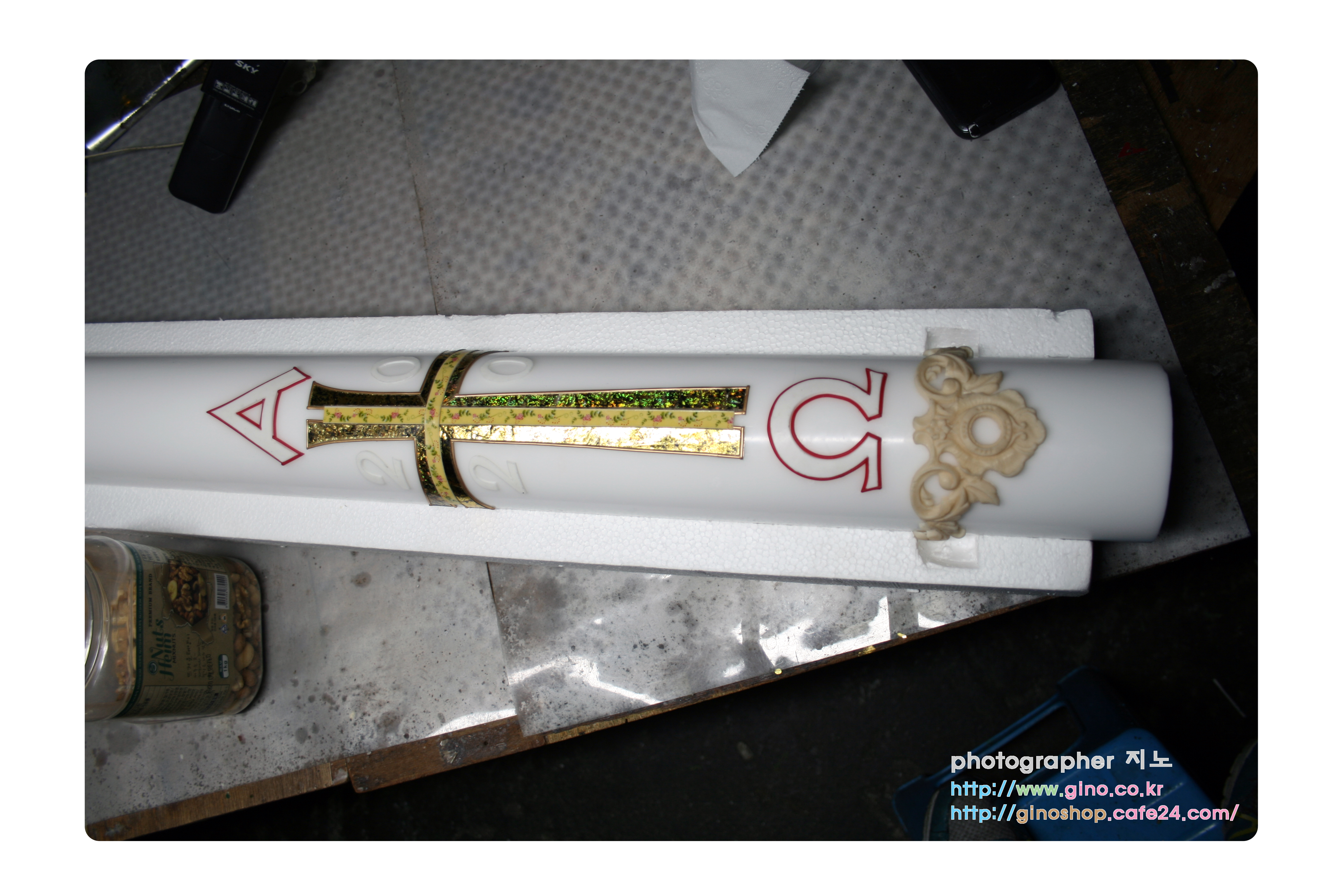 지금 보여드리는 부활 양초는 알파 오메가 십자가 부분에 벌집 모양 금박 왁스 시트를 적용을 시켰는데요.