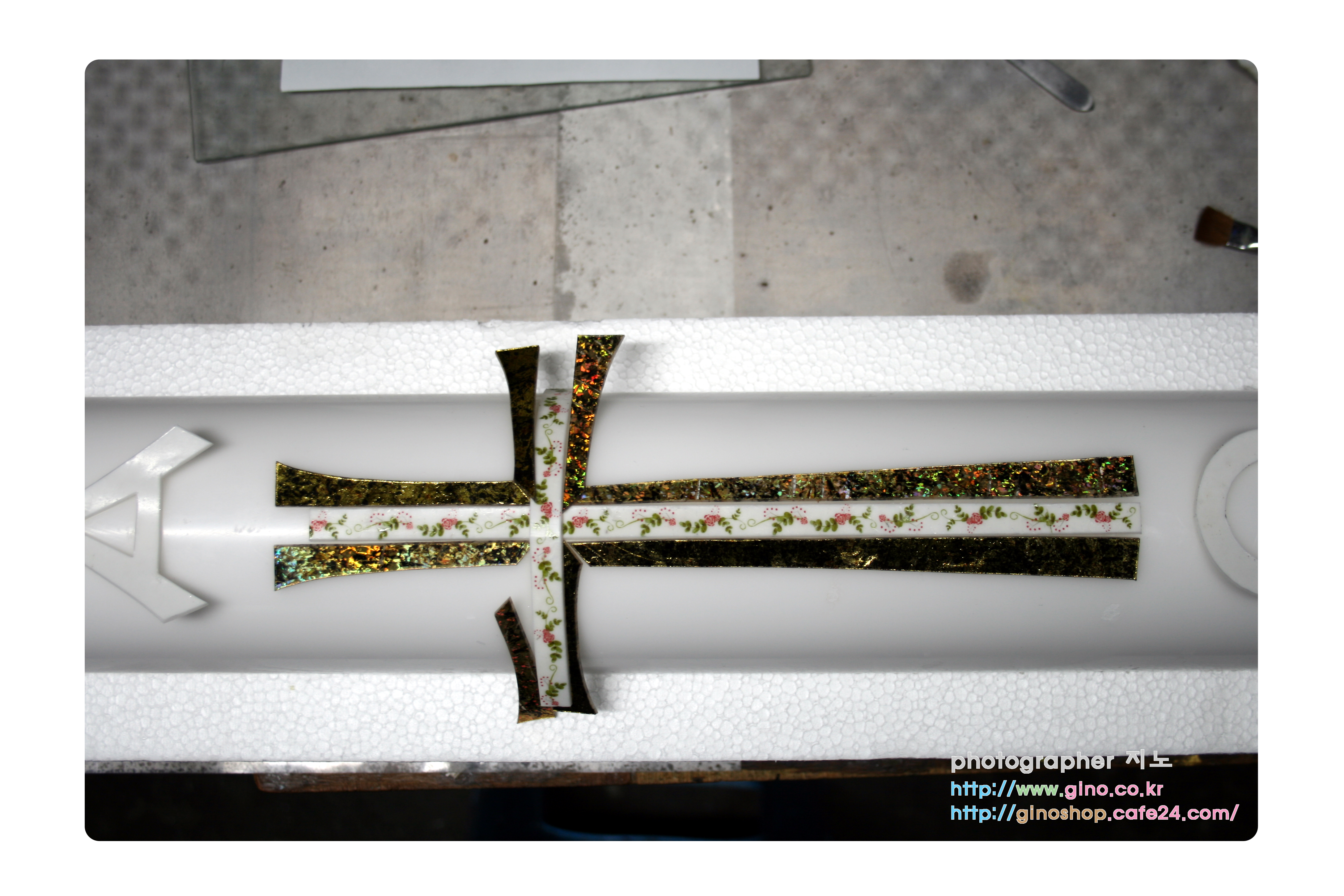 금색 톤 십자가 테두리 부분에는 금박 왁스 시트로 테두리 포인트 작업을 하였으며, 알파와 오메가 글씨 부분은 스톤 왁스 시트를 적용을 시키고 테두리에는 은박 왁스 시트로 테두리 포인트 작업을 하였습니다.