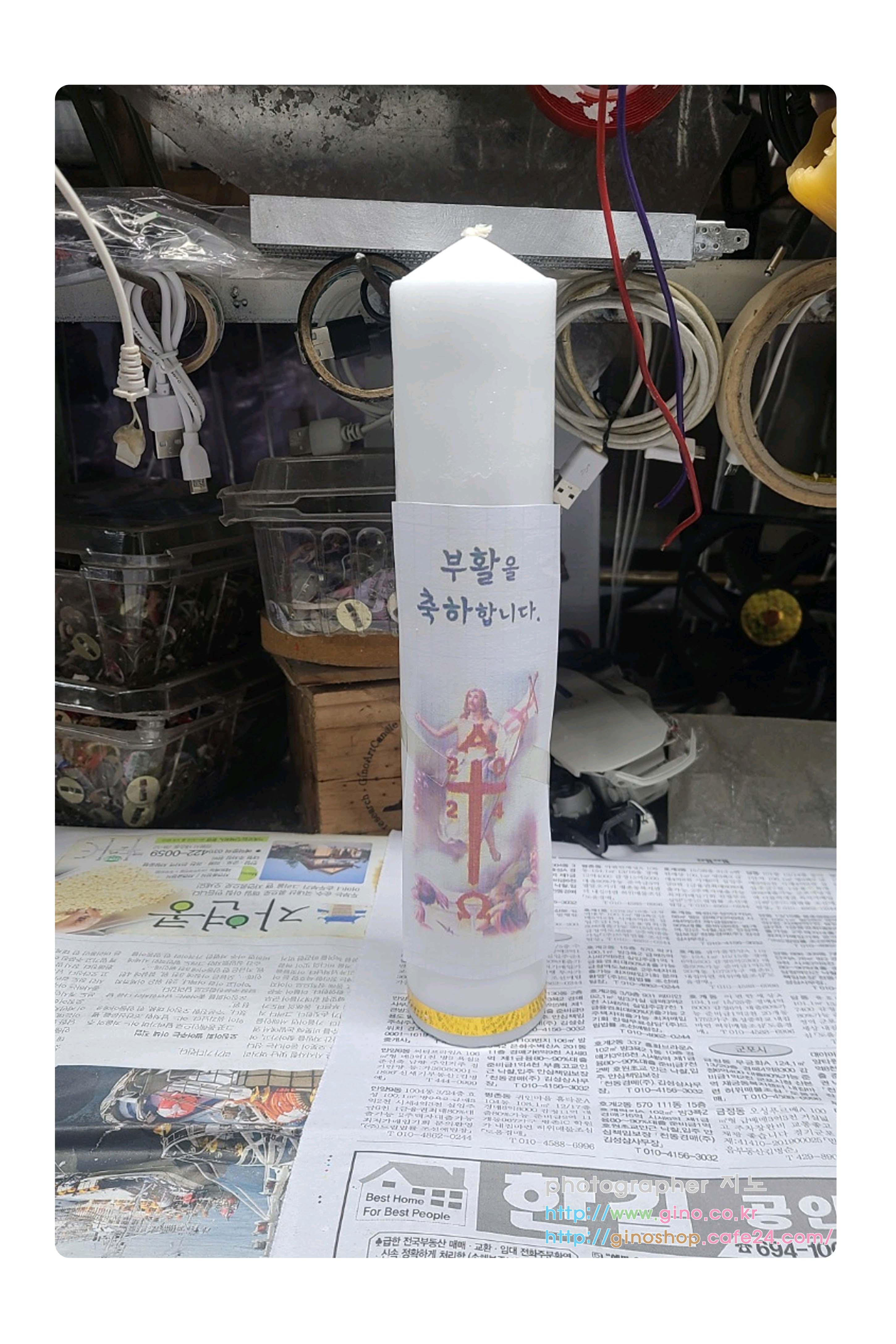 종이로 인쇄하여 양초에 붙인 사진 보여드립니다.