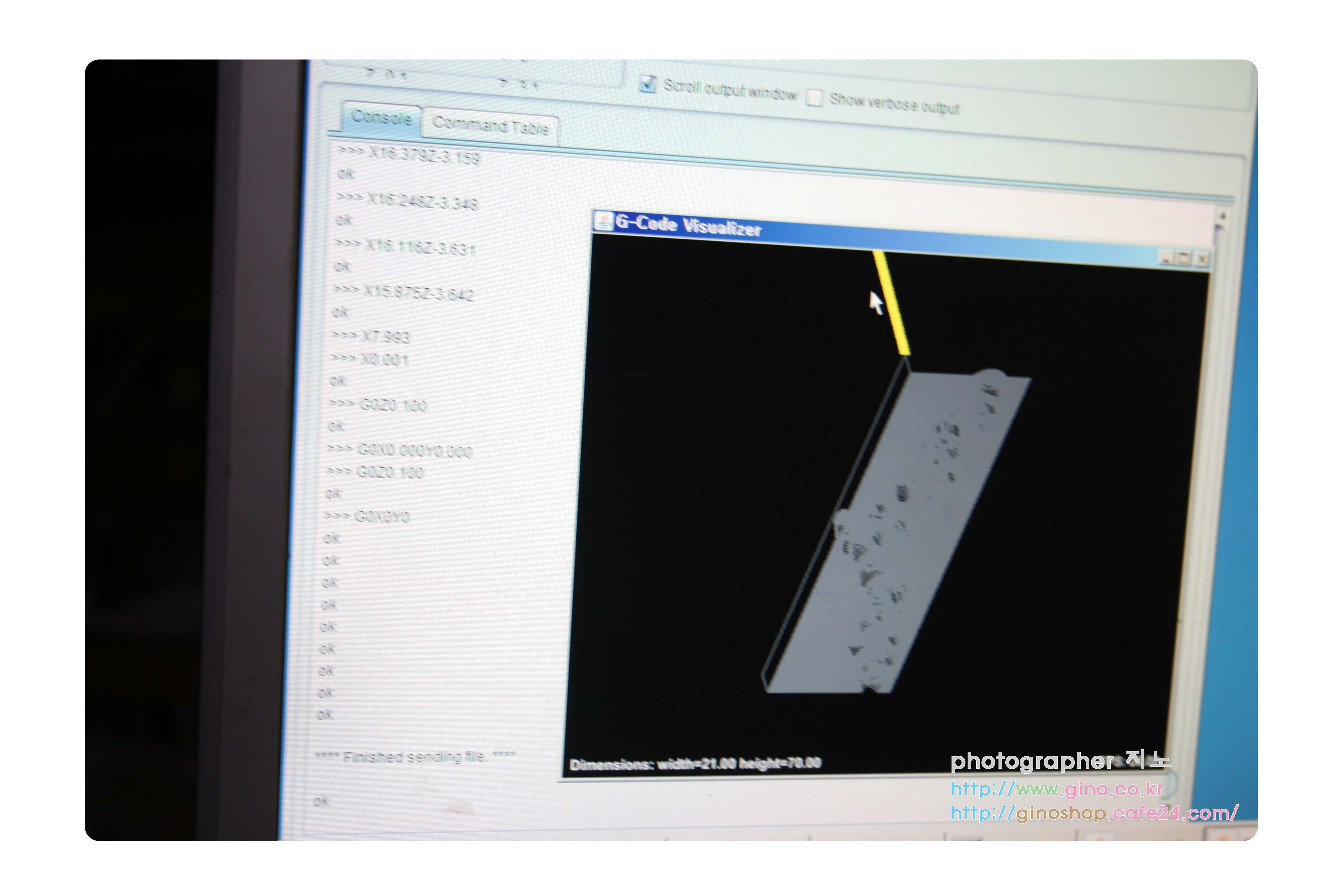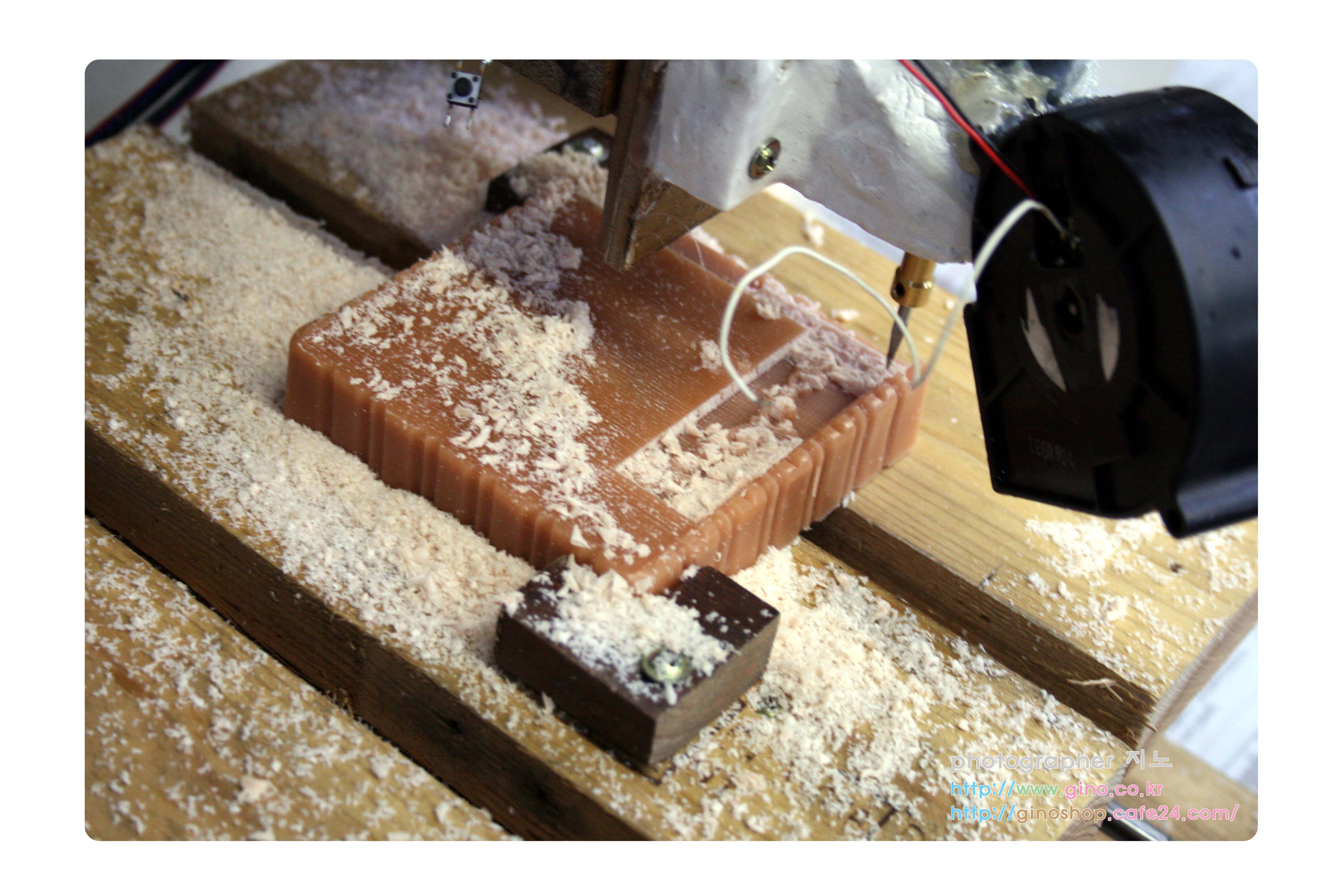 기초적은 프레임은 나무로 최대한 정밀하게 노력하여 뼈대를 x,y,z축으로 개별적으로 구축후 연결 합체 작업으로 본체를 만들고, 2번째 머리 부분에 해당되는 하드웨어 세팅및 소프트웨어 실습에 여기에 시간이 많아 걸림. 저 나름 구색이 어느정도 가추어진 자작 cnc를 구동 테스트 해본 결과 강철은 안됨, 나무도 좀 벅참, 석고(고려중) 그래서 최종적으로 선택한 것이 카빙 왁스라는 금방공예나 주물등에 밑바탕 조각을 하는데 사용하는 재료를 또 인터넷의 서핑으로 만드는 방법을 다방면으로 수집후 테스트 샘플을 만들어서 1차 테스트하였지만, 너무 왁스가 물러서 찌꺼기가 조각 옆에 붙어서 인지 아니면 자작 초경이 정밀도가 떨어져서 인지 정확히 파악이 안됨, 문제된 부분은 계속 연습을 통하여 문제를 숙지후 이와 비슷한 내용을 정보의바다인 인터넷 선생님을 통하여 몇몇의 외국 사례를 찾아보니, 왁스의강도, 모터의 스핀들 속도, 프로그램과 초경의 값이 안맞아서 이럴수도 있다는 내용을 봄.