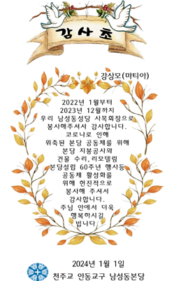 | 안동교구 남성동성당 감사초 초안 (0) | 2024.01.03 |