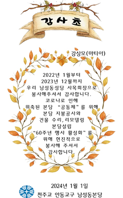 2022년 1월부터 2023년 12월까지 우리 남성동성당 사목회장으로 봉사해주셔서 감사합니다. 코로나로 인해 위축된 본당 공동체를 위해 본당 지붕공사와 건물 수리,리모델링 본당설립 60주년 행사 활성화를 위해 헌진적으로 봉사해 주셔서 감사합니다.
