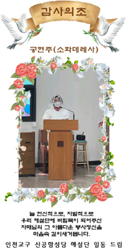 주님의 뜻에 따라 인천교구 신공항성당 해설단에서 20년간사랑과 희생으로 봉사해주심에 깊은 감사드립니다. 주님의 은총이 언제나 함께하시길 기도드리며 저희 신공항성당 해설단원들의 마음을 모아드립니다.