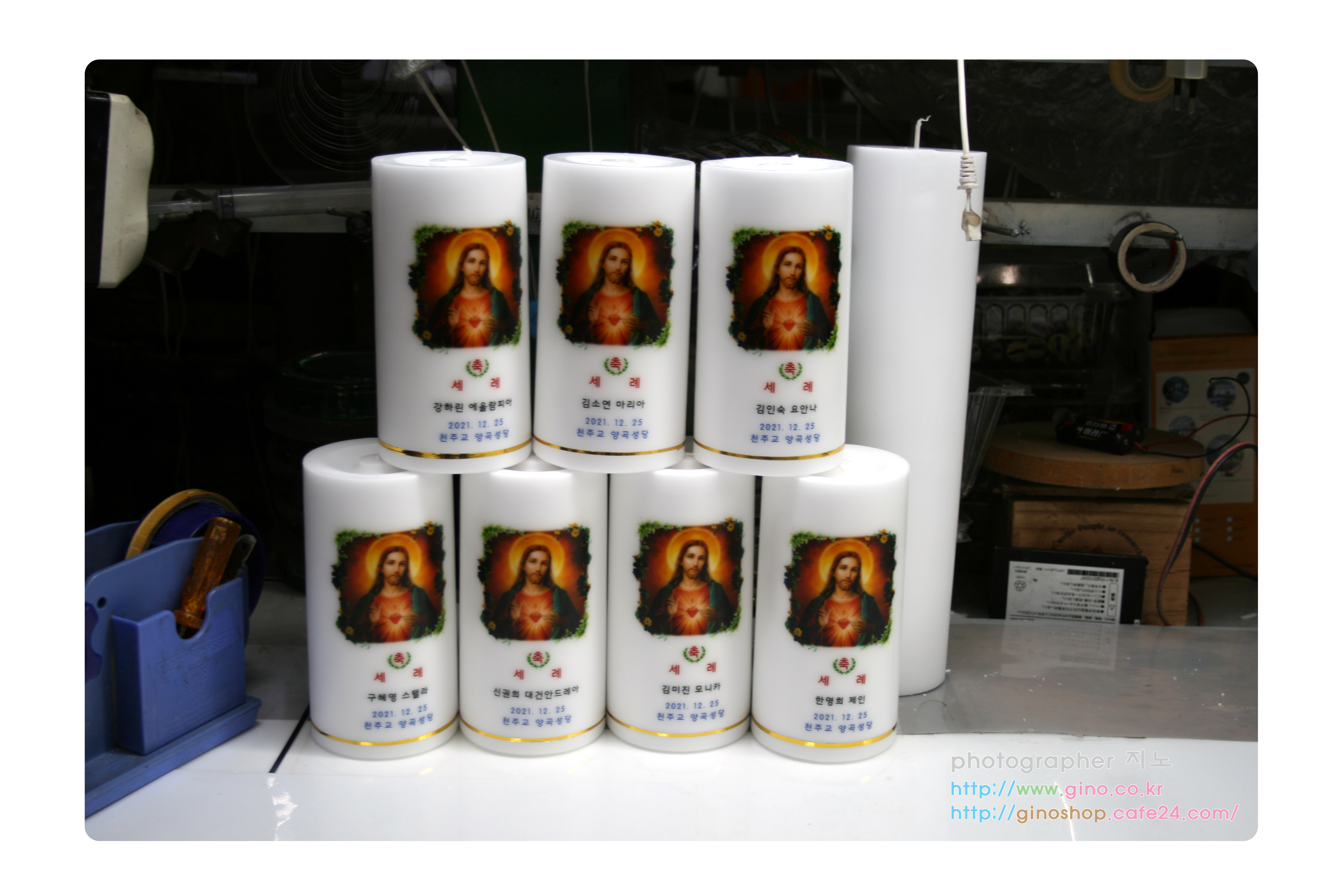 성남동성당에서 축세례 행사때 사용하기 위해서 개별 이름을 넣어 주문 제작을 하신 양초 캔들입니다.