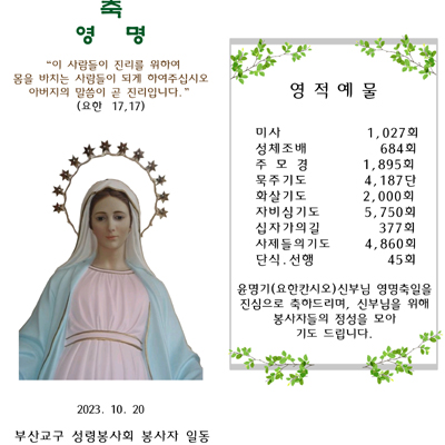 미사,영성체     :          1,805회 묵 주 기 도        :         54,755단 주 모 경             :           9,703회 희생  봉사          :             933회 화살기도           :            453회 사제를위한기도   :     8,511회