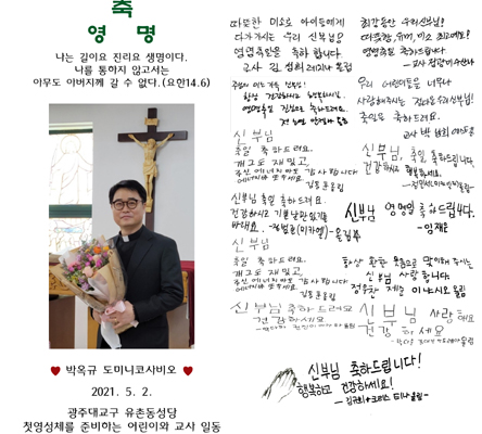 이동명 사도요한 신부님의 영명축일을 진심으로 축하드리며 영육간의 건강을 기원 드립니다. 아울러 신부님께서 걷는 걸음마다 늘 주님의 축복과 은총이 함께 하시길 한마음으로 기도드립니다. 신부님 사랑합니다. 고맙습니다.