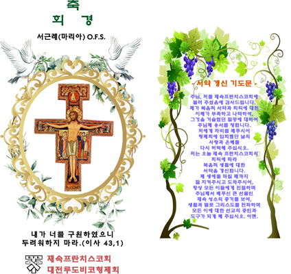 | - 서약 갱신 기도문 - 주님, 저를 재속프란치스코회에 불러 주셨음에 감사드립니다. 제가 복음적 서약과 회칙에 대한 이해가 부족하고 나약하여, 그것을 거슬렀던 잘못에 대하여 주님께 용서를 청합니다. 저에게 자비를 베푸시어 형제회에 입회했던 날의 사랑과 은혜를 다시 허락해 주십시오. 저는 오늘 재속 프란치스코회의 회칙에 따라 복음적 생활에 대한 서약을 갱신합니다. 제 생애를 마칠 때까지 잘 지켜주시고 도와주시어, 항상 모든 이들에게 친절하며 주님께서 베푸신 큰 선물인 재속 성소의 증거를 보여, 생활과 말로 그리스도를 전파하며 모든 이에 대한 선교의 증인과 도구가 되게 해 주십시오. 아멘. |