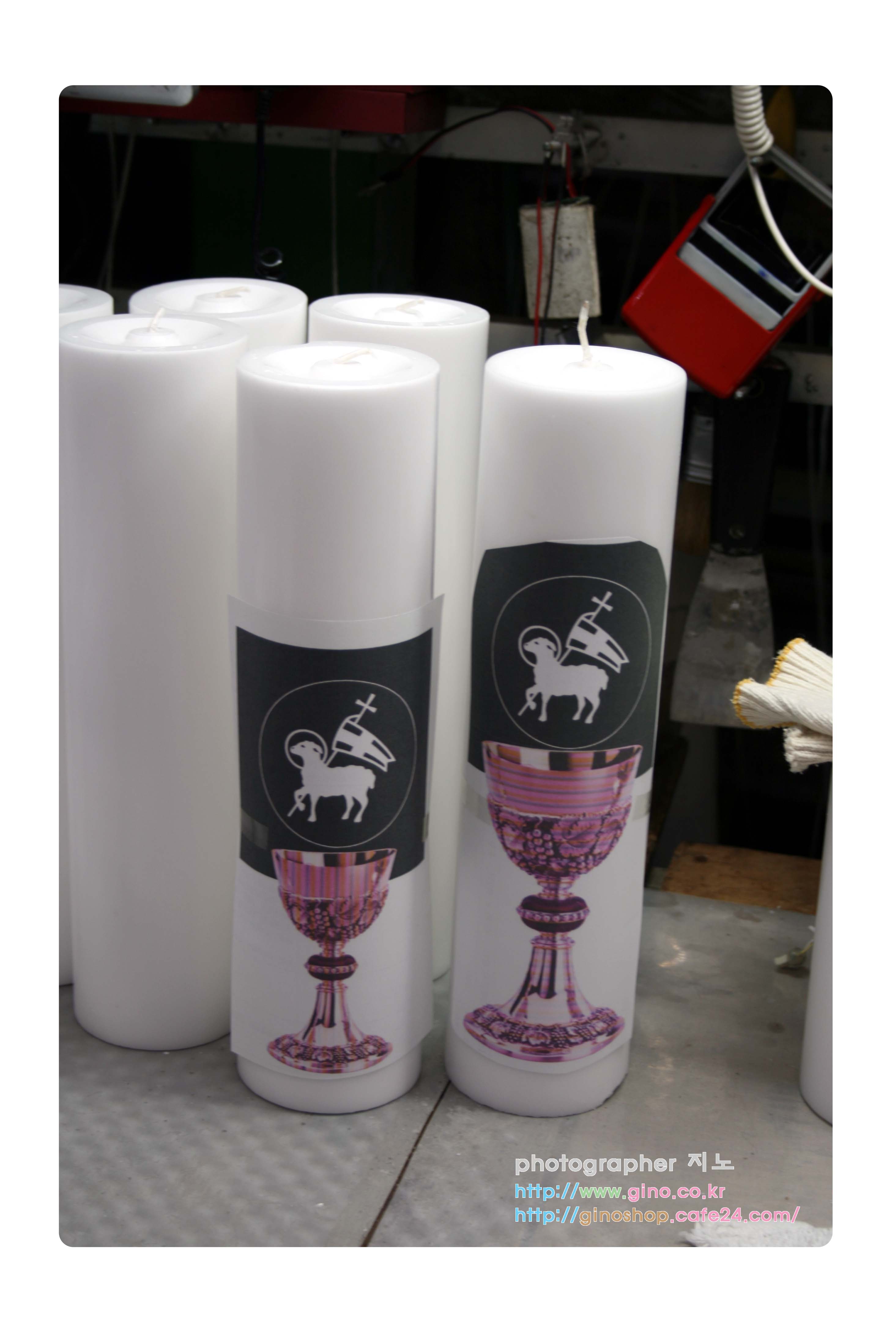 본견적으로 초에 왁스 시트들을 붙여 나갑니다. 배열에 맞추어 알파 오메가 십자가를 붙이고 알파와 오메가는 이번에는 새로 개발한 적색 엔틱 캔들 왁스 시트를 테두리 포인트를 적용을 해보았으며, 십자가의 부각을 시켜주기 위해서 무광금박에 문향을 넣은 박은 붙이고 모서리에는 밋무늬로 마감 처리를 해주어 보았습니다. 그리고 최종 완성본인 조각한 성작에 인쇄를 하였는데, 이미지 부분을 조금 수정을 적용을 해야 할듯하며, 중앙의 키포인트인 천주의어린양 과 원모양으로 딴 은박 캔들 왁스 시트를 다 올려두고 본 느낌은 좀 이질적인 느낌이 납니다. 그래서 은박 원을 빼고 어린양을 흰색으로 교체를 해서 다시 조정을 해나갑니다.